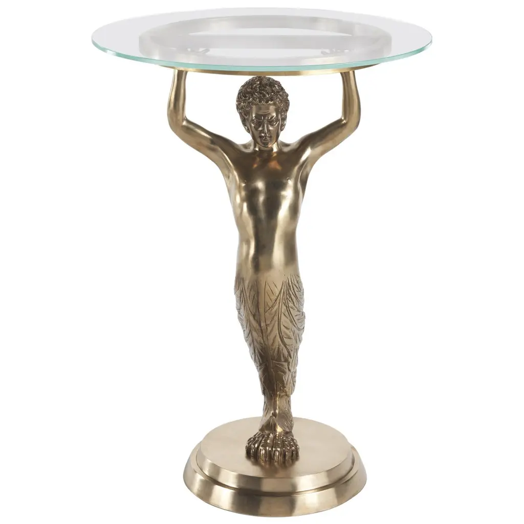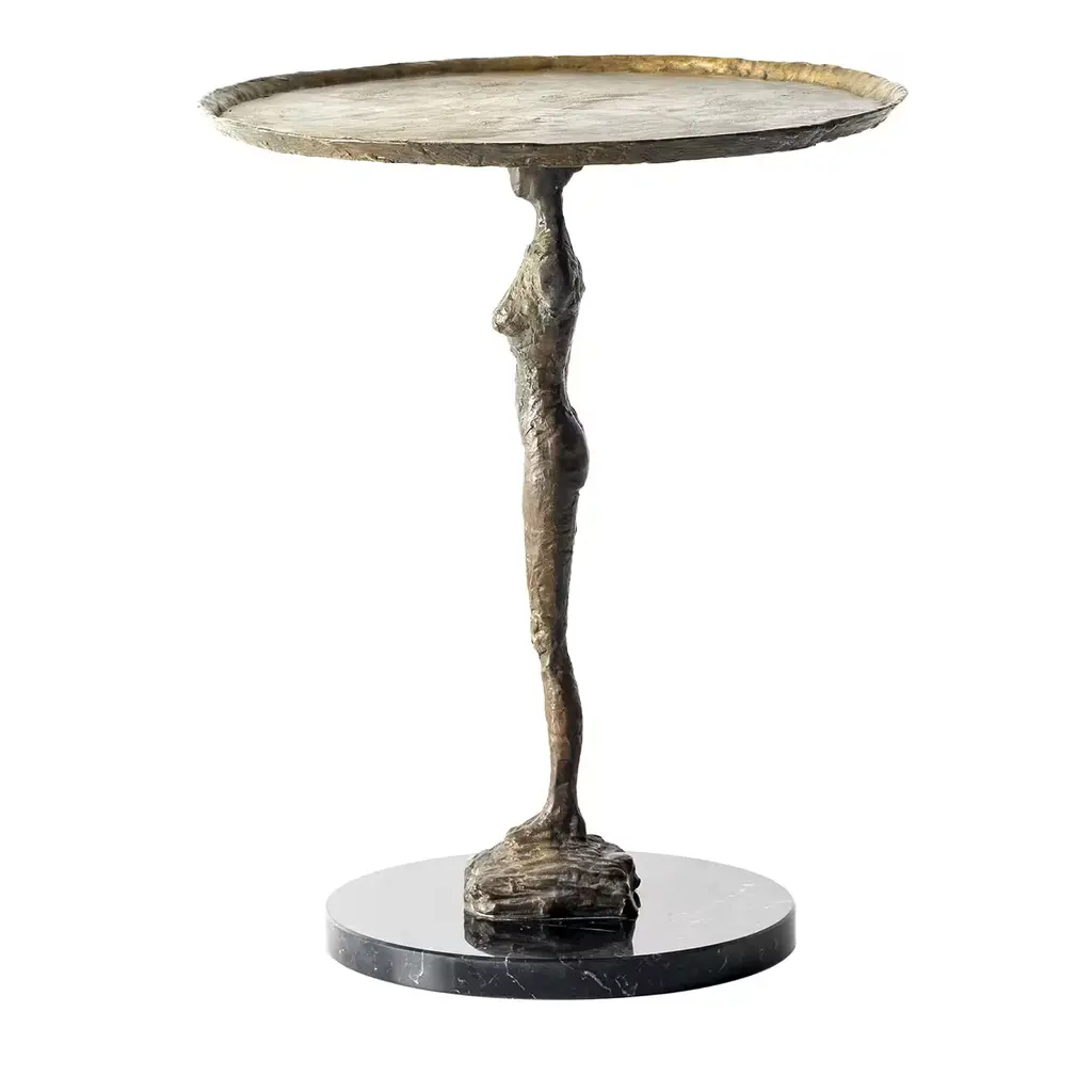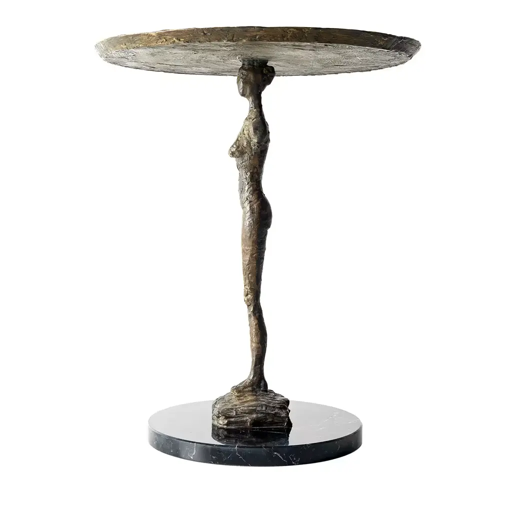An eye-catching piece, this lavish side table will add timeless glamour to any any decor. Made of bronze with an antiqued finish, the sleek silhouette features a delicate round tray supported by a slender silhouette of a woman, reminiscent of the timeless Venus de Milo ancient Greek statue. The tactile finish of the bronze statue infuses neo-classic allure to the piece that will be best showcased as a pair alongside Him Side Table from the same collection.