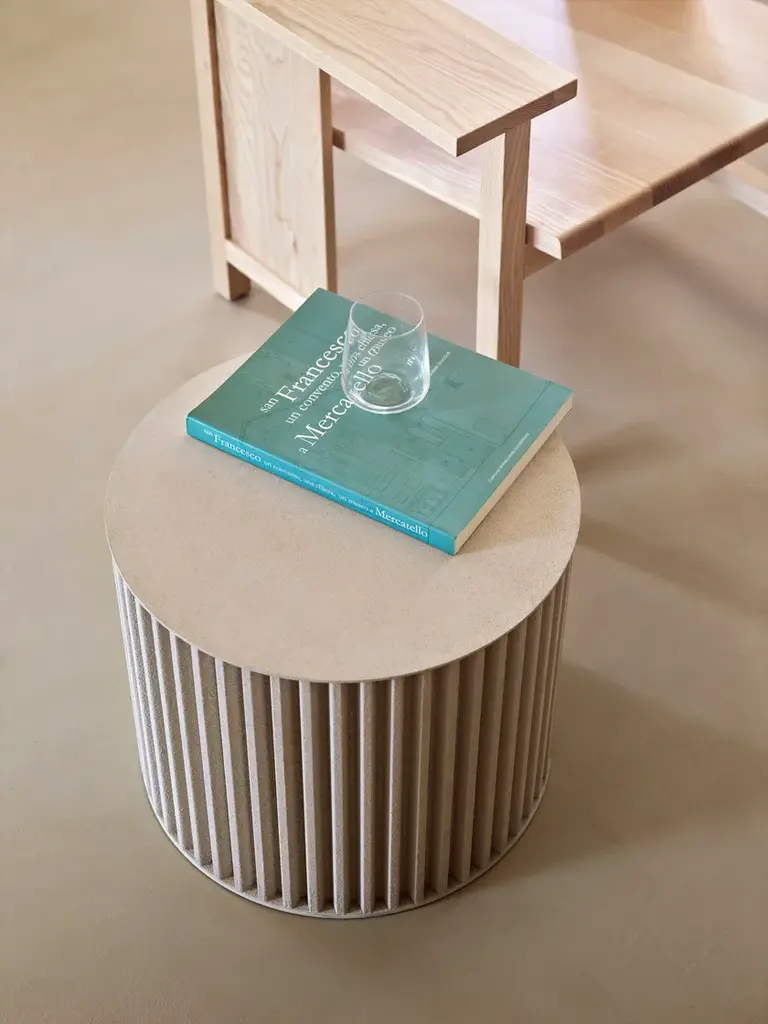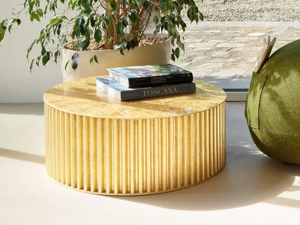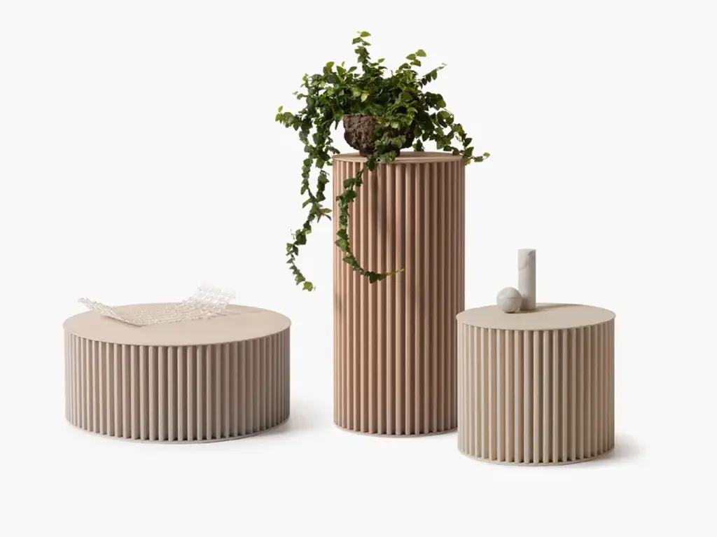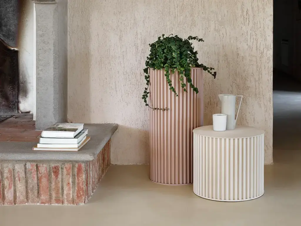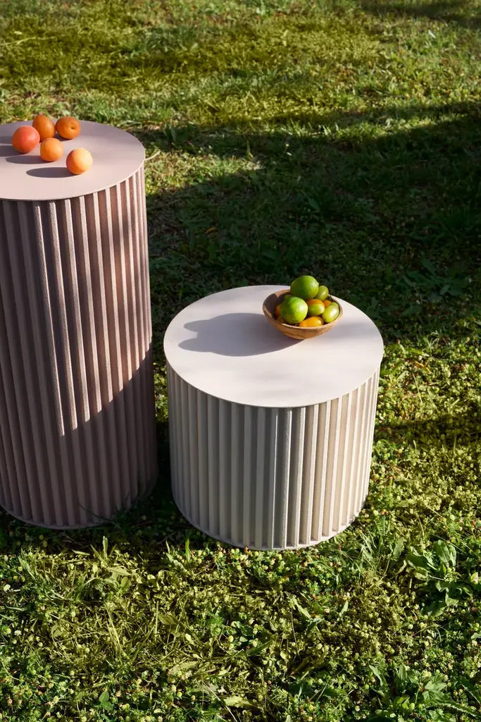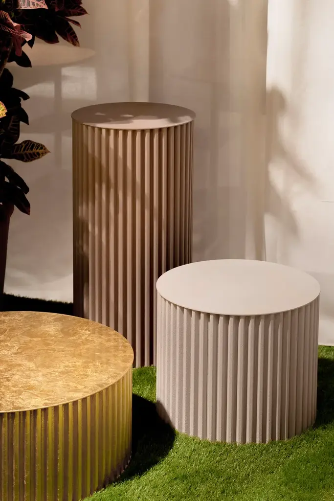 Herclino is a round aluminum coffee table, for indoor and outdoor use, available in three sizes.Material finishes: Corkcrete in beige, grey or taupe.Glossy finishes: gold leaf (indoor use).Corkcrete is a special ecological mortar resulting from a combination of cork and water-based natural resins.The application of the Corkcrete and gold leaf finish is handcrafted, each piece is therefore unique with variations in finish.Herclino, the coffee table series, part of the Hercle collection designed by Lapo Ciatti, was created with the intention of combining, in an object of everyday use, the timeless charm of ancient Greece with avant-garde materials, the result of Opinion Ciatti's attention to sustainability issues.On the one hand, their shape mimics that of a typical fluted column, while on the other hand, the special cork finish that covers them is evidence of the commitment to environmental protection.