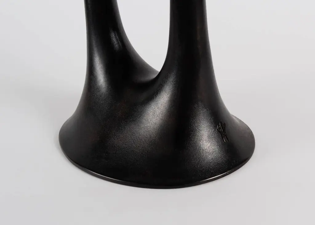 A side table with a solid, patinated bronze base, a polished bronze top and, despite its thorn motif (familiar to the work of van der Straeten) a shape reminiscent of the human form.