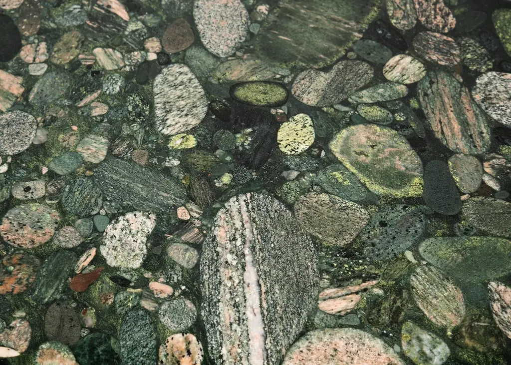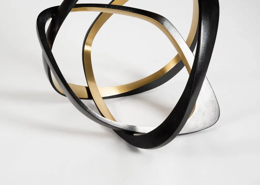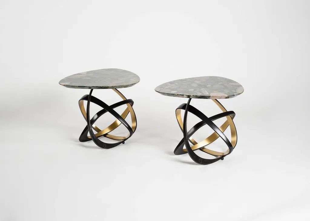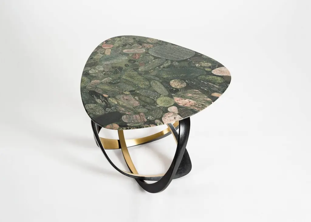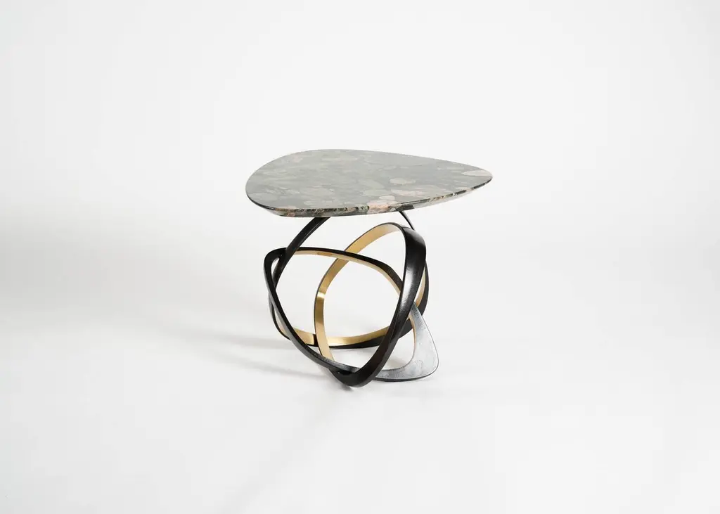 This contemporary table features a marinace marble top set with cross-sectioned stones, as well as three lopsided bronze supports, each with a gilt bronze facet. These dynamic metal rings provide a light, airy aesthetic and successfully evince space and motion—and in short, provide an extraordinary base for such a substantial stone top to be balanced upon.