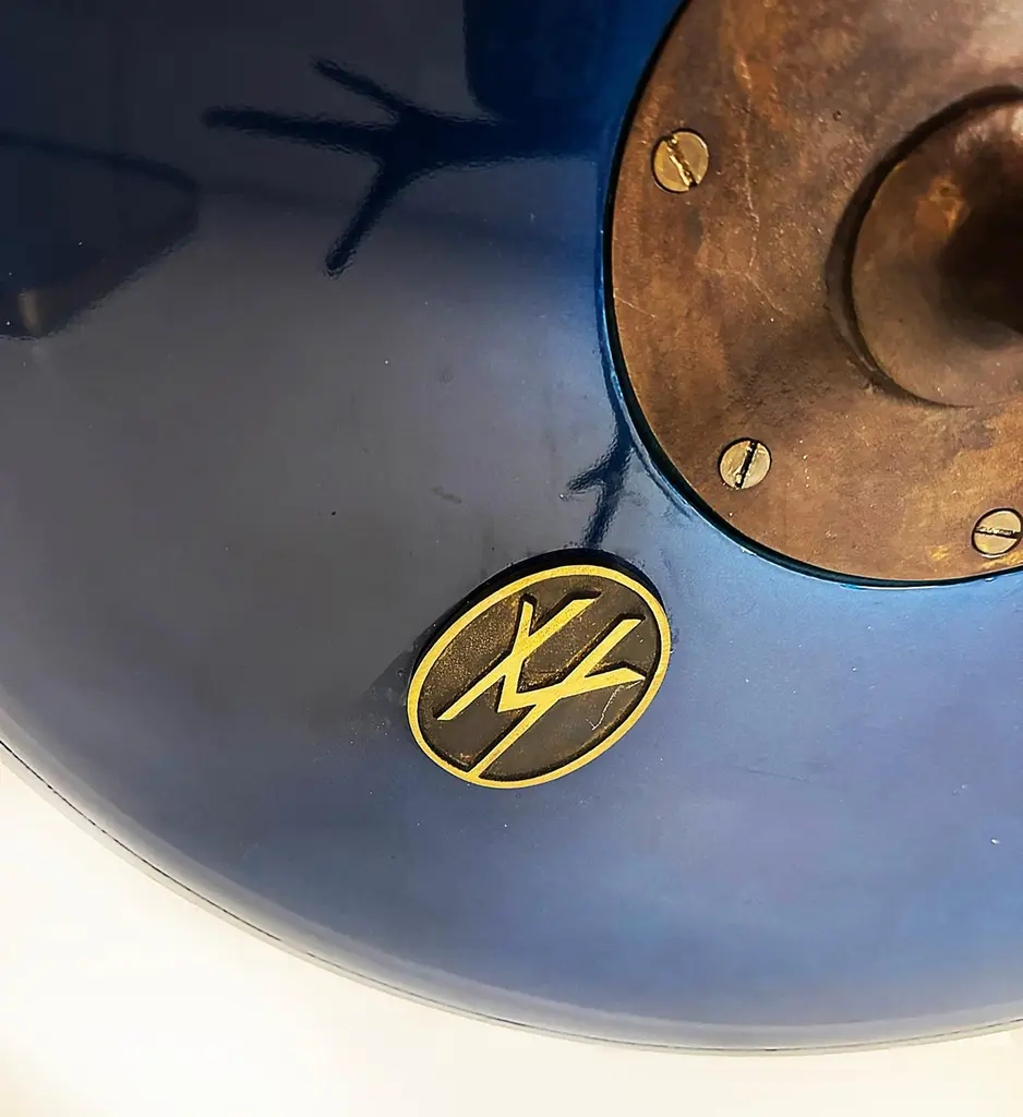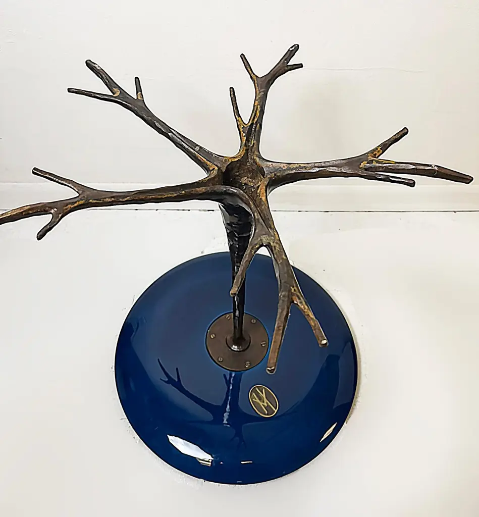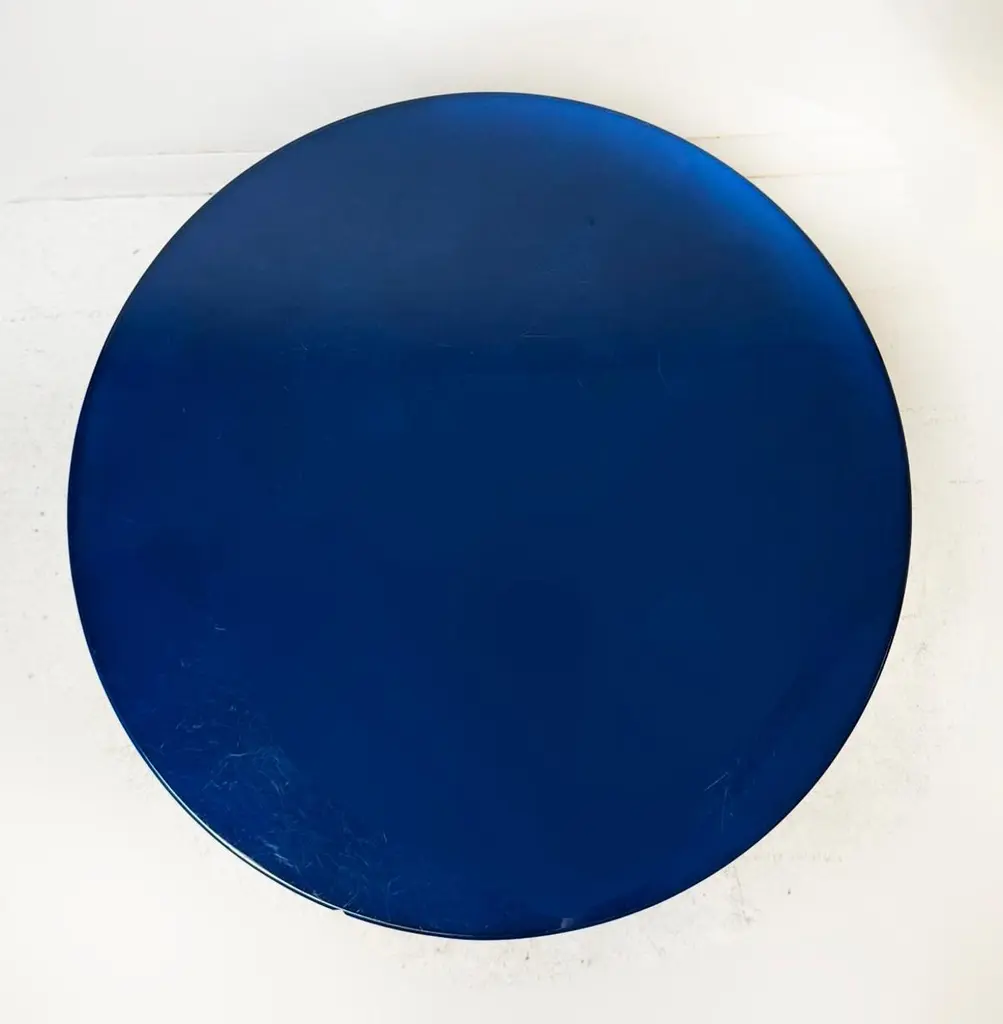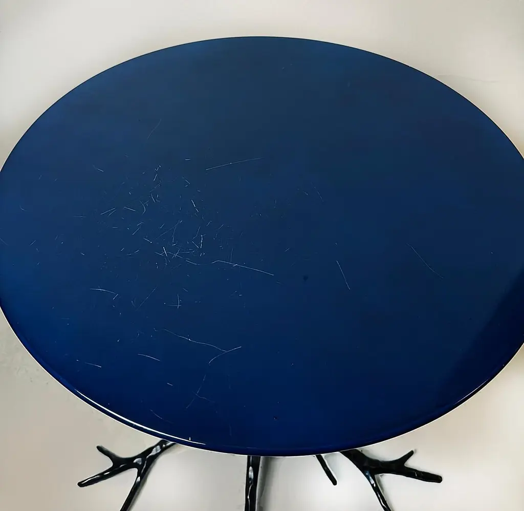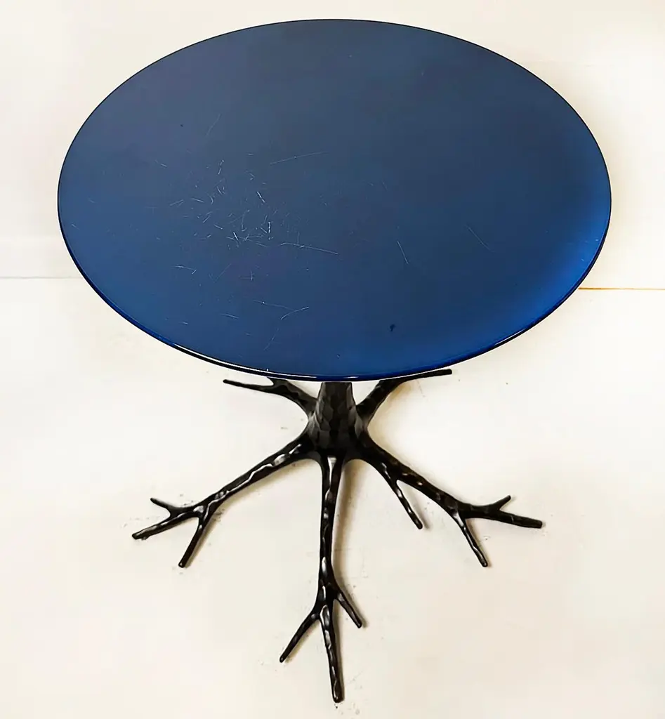 Hervé Van der Straeten, Ralph Pucci Gieridon Sylvestre Table in Bronze, WoodOffered for sale is a single Ralph Pucci "Sylvestre" bronze and blue lacquered wood side table by Hervé Van der Straeten. These tables were made of morello cherry wood or faded plum wood with patinated bronze bases. These tables are sold individually, with 2 being available. Hervé Van der Straeten was born in 1965 and is an independent artist-designer who was first known for his jewelry creations, and now enjoys worldwide recognition for his furniture and lighting, which are instantly recognizable for the way he combines contrasting materials, bold variations of form and defiant volumes with perfect proportions, precision and detail. He designs and makes everything in his own dedicated bronze and cabinet making workshops and displays a selection of both his unique and limited-edition pieces in his own gallery in Paris. The artist-designer is also known for his projects with French luxury houses. Van der Straeten has received numerous awards from the French government during his career including L’Enterprise du Patrimonie Vivant and the Chevalier des Arts et des Lettres. He joined RALPH PUCCI in 2004.The underside of the table retains the maker's bronze tag. 19.29" W x 19.29" D x 20.88" H