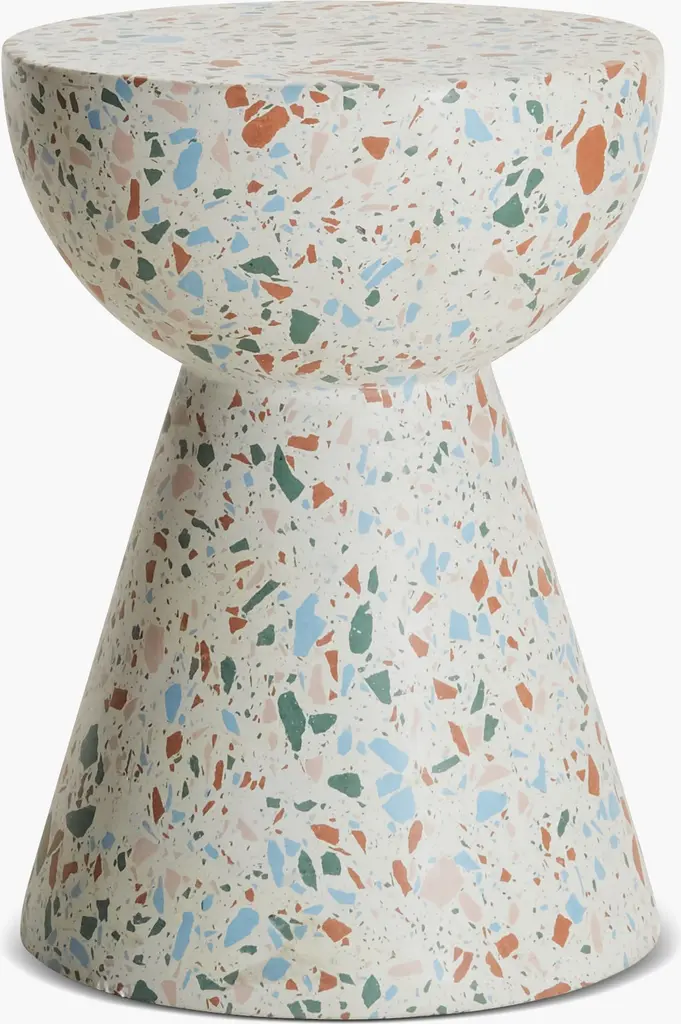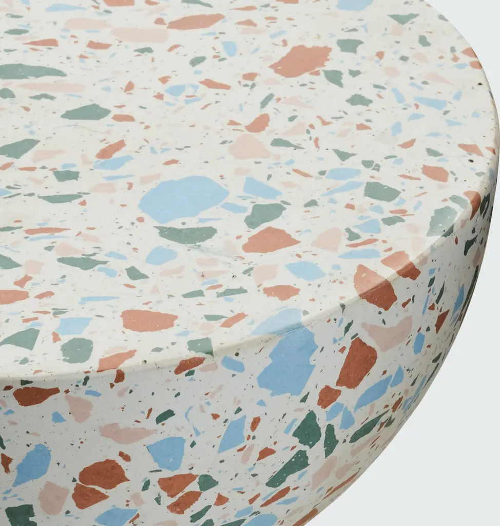 Pat Kim's Hew Table in wood has been a bestseller since its launch in 2018, and now this DWR exclusive collection is available in terrazzo. Because of the quality of the material and the large number of colored concrete chips, the patterns are random and yet beautifully balanced. This durable, heavy table is made of terrazzo all the way through, not just on the top layer. Not for outdoor use. Made in India.