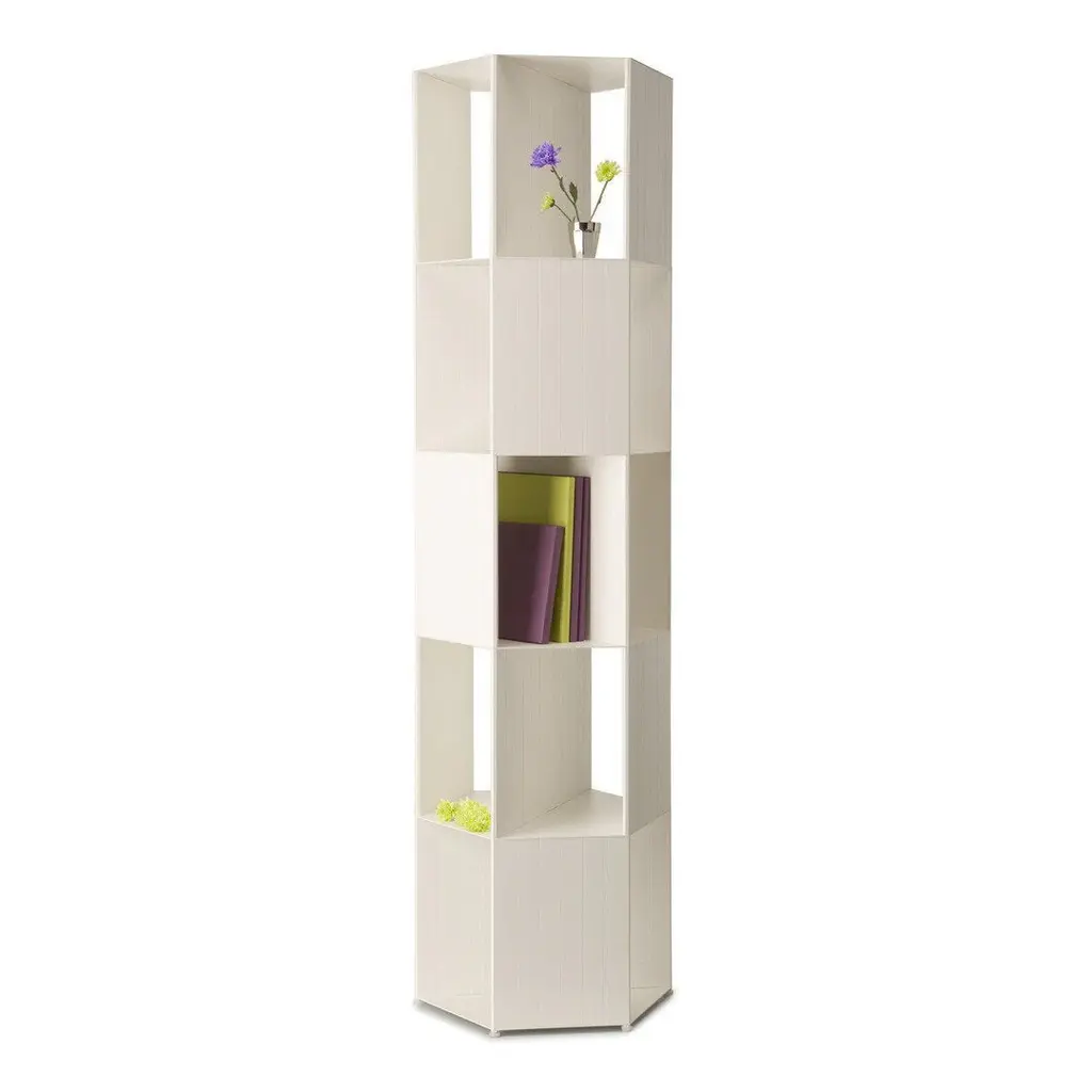 HEXAGON is a contemporary interpretation of a form, already known in ancient Greek geometry. The regular six-edged-units are each divided by vertical sheets. Stacked they produce a beautiful rotational symmetry, typical for the hexagon, which NENDO cleverly exploits. Hexagon is a multifunctional, freestanding object. It can be used as bookcase, showcase, (bed) side table or pedestal.