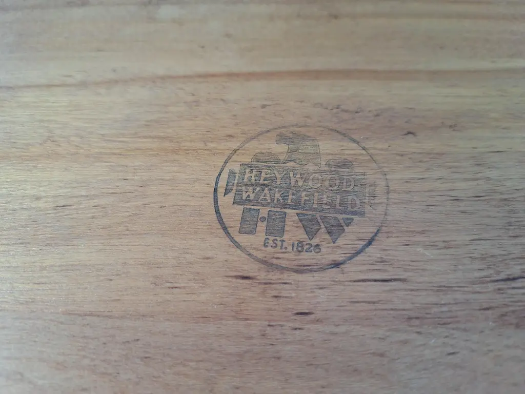 Pair of vintage Heywood Wakefield bamboo step side tables with teak surfaces. Stamped makers mark on underside.