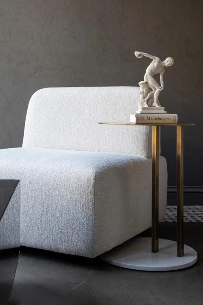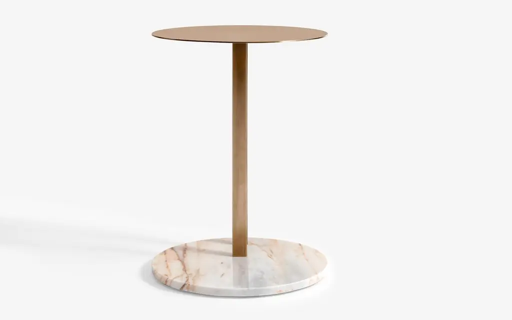 The Hidden C side table is a stunning piece of furniture designed with a marble base and a brass top that seamlessly intersect to create a flawless look. This side table is unique in that it features a hidden "C" shape that allows it to be easily inserted into the seat of a chair or sofa, providing a convenient and stylish surface for drinks, books, or other small items. The combination of high-quality materials and expert craftsmanship ensures that this side table is not only beautiful but also durable and long-lasting. Whether used in a living room, bedroom, or office, the Hidden C side table is sure to add elegance and sophistication to any space.Measures: diameter: 48 cm / Height: 64 cmWeight: 22 kg- Carrara white marble-Brass Coated Metal-Registered design Alternatives:carrara white marble / emperador dark marble / rainforest marblematt chrome / black painted metalCustomizable.MARBLE USE AND CAREClean surfaces with a slightly damp cloth.Materials have a natural identity; time, ultraviolet light, original character all contribute to the individuality of the piece.Refer to the sales form for care and specification information.Do not use chemical products directly on Lagu products. Some ingredients may cause damage to surfaces.Avoid contact with hot and sharp objects to product surfaces.Please contact us for transportation and surface change decisions. BRASS USE AND CAREClean surfaces with a dry cloth.Minimize humidity and conditions that attract humidity.Ensure surfaces are dry after cleaning.Do not use chemical products directly on Lagu products. Some ingredients may cause damage to surfaces.Avoid contact with hot and sharp objects to product surfaces.