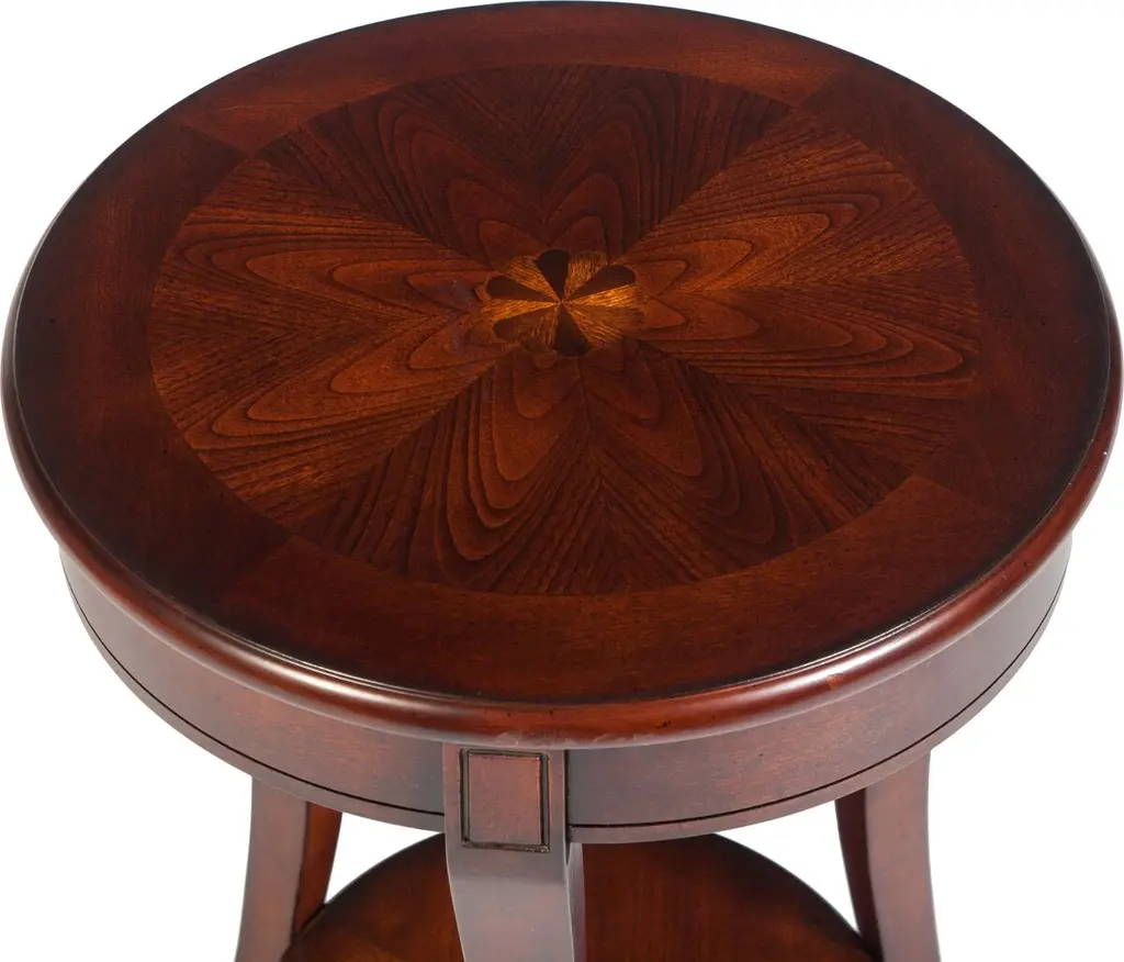 The Higgins Round Side Table is perfect for any living space, featuring an exceptional blend of wood using select solids and choice veneers. It includes a lower shelf for storage, adding a contemporary feel to your decor.