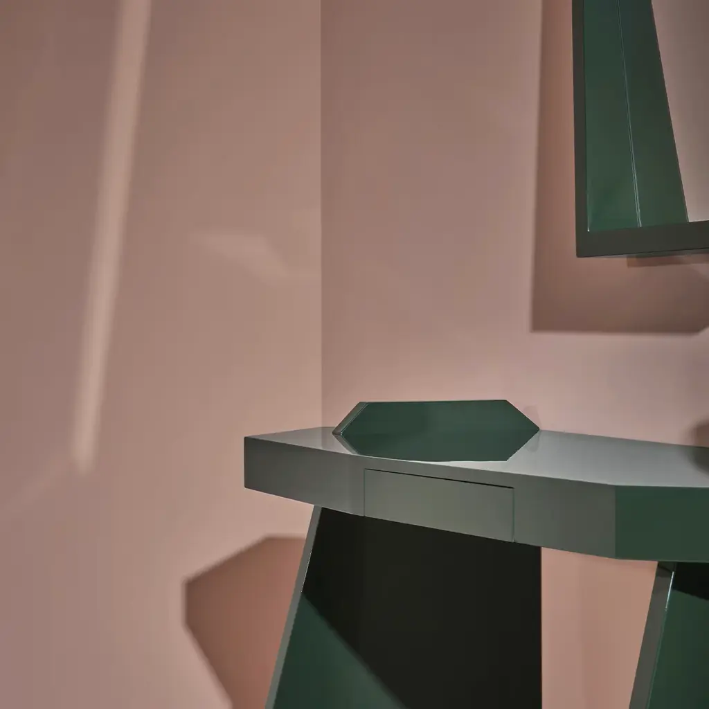 This desk is born from the belief that design should be used to elevate everyday life and make it more special. Both functional and aesthetically appealing, its elegant silhouette features strong lines and sculptural shapes making it the perfect embodiment of high-end, Italian artisanal design. Its minimalist structure in dark green is striking yet subtle.