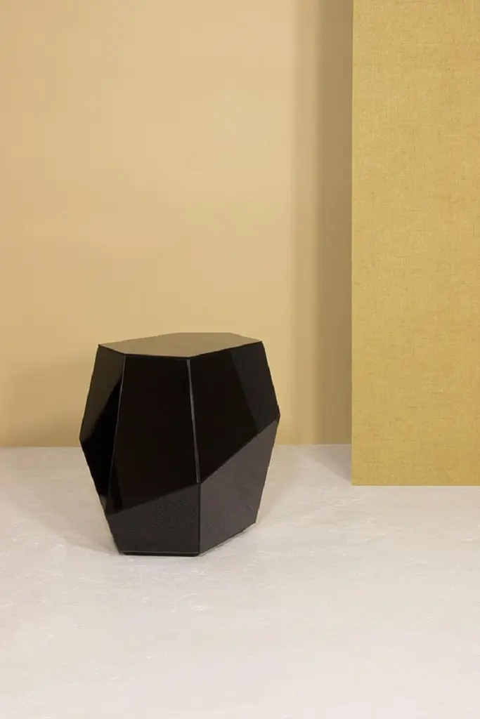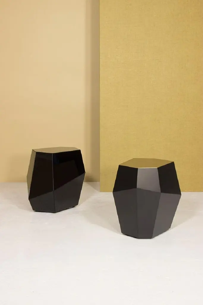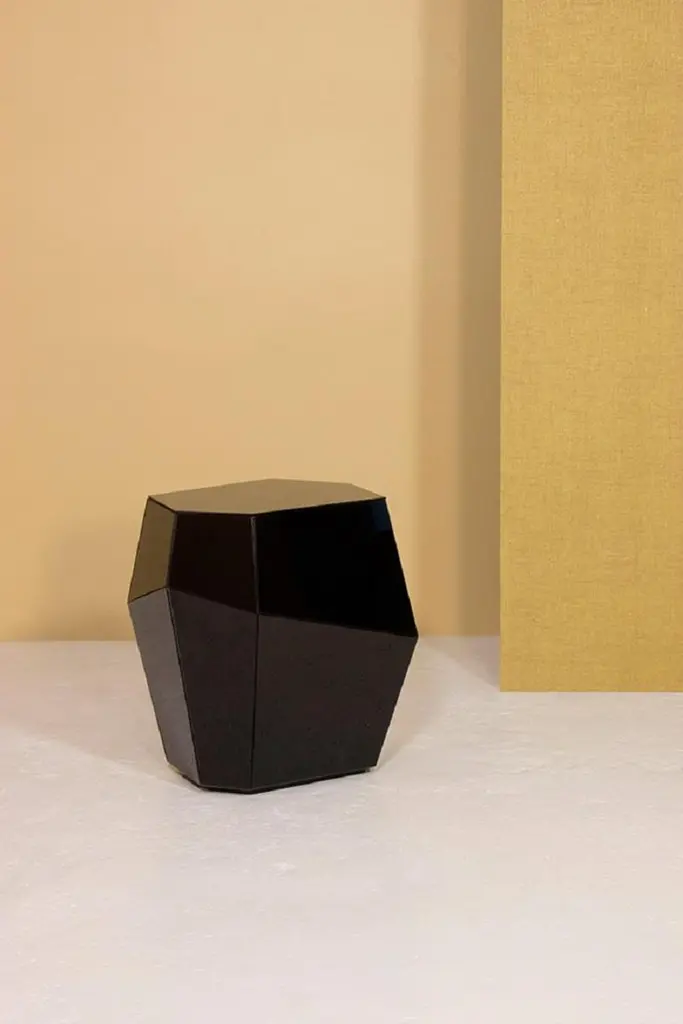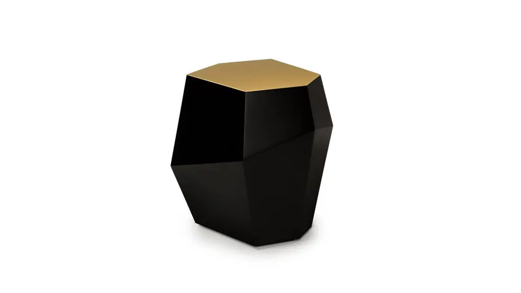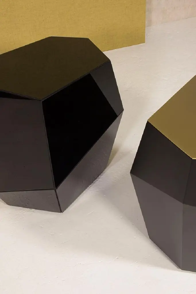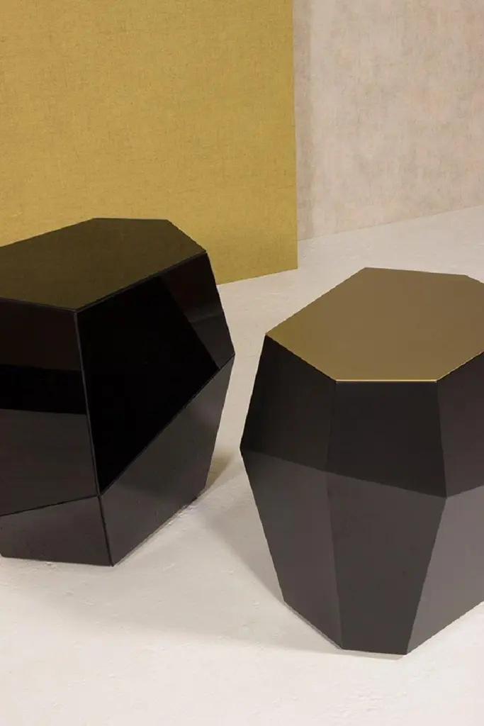 High Three Rocks Black and Brass Side Table by InsidherLandDimensions: D 40 x W 51 x H 48 cm.Materials: Black lacquered, brushed brass.8 kg.Other materials available.From The Special Tree, Fallen Leaves on the water reflected the faces of two lovers as mirrors, while others fighters still remained in some Tree Branches. Completing that scenario, a few leaves were on the center of the lake stretched over Three Rocks of different sizes, sparkling by water that ran on them.The robust volumes, with their shapes irregularly cut, are finished in smoky brown birds eye veneer in high gloss varnish. The small dotted nodules of this veneer resembling the texture of a true rock and the high gloss finish to the lake water, making of these three tables almost an exact picture of the idyllic and passionate vision of that lake in autumn.Fallen freely on each of the three tables, we find small leaves embedded by the hands of a craftsman with the art of marquetry. The work is performed entirely by hand with wisdom and perfection so the observer loses himself in this story in which nature and love don’t have barriers and celebrate the marriage between reality and fiction.Created by Architect Joana Santos Barbosa in 2012, InsidherLand is a Portuguese brand of exclusive design. Drawn with the signature of the creator, the impressive range of contemporary luxury furniture, lighting, upholstery and accessories are connected to her personal memories and have been highlighted for their innovative and soulful designs.Joana explores several influences from travels around the world to define her own Land as a place that allows her to translate her perceptions into objects of art.The essence of InsidherLand is presented by two inspiring collections. Beyond Memory Collection is deeply influenced by organic forms of nature, legends and traditional cultures, as for the Identity Collection is molded by forms of Architecture and Art. Both collections are designed as a dialog in which nature meets strong architectural lines to create relaxed and sophisticated interiors surrounded by natural materials and meaningful art pieces.Being positioned in strategic markets of high-end luxury decoration, InsidherLand team is proud of working with the best architects and interior design studios from all over the world who seek for handmade exclusive objects that arouse emotions and stand out in exquisite spaces.We are dedicated with love and enthusiasm into every creation to surprise a sensitive but demanding public. Using the expertise of traditional craft techniques, all creations are made by the hands of Portuguese master craftsmen and jewelers who wisely sculpt them in noble materials, finalizing every detail with elegance and perfection.