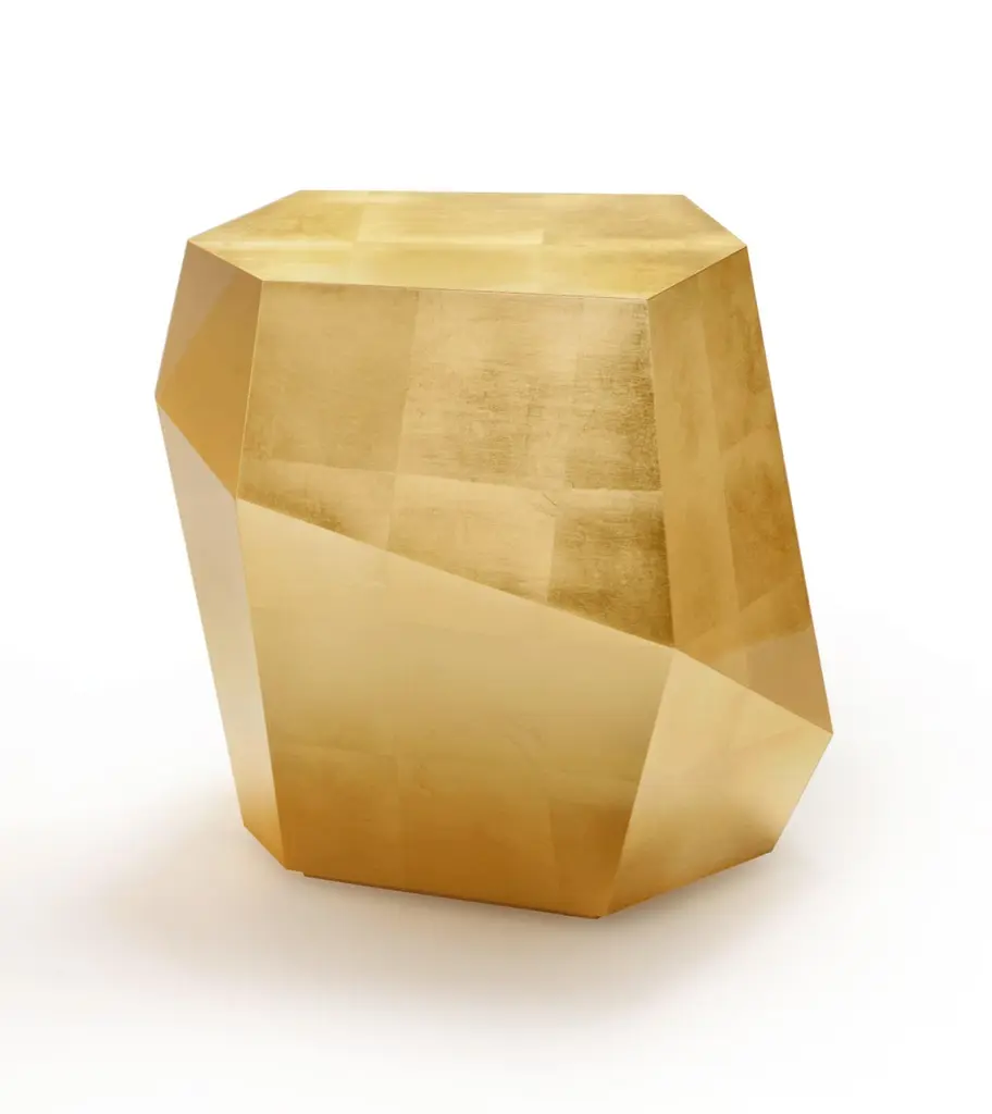 High Three Rocks Gold Leaf Side Table by InsidherLandDimensions: D 40 x W 51 x H 48 cm.Materials: Gold leaf.7 kg.Other materials available.From The Special Tree, Fallen Leaves on the water reflected the faces of two lovers as mirrors, while others fighters still remained in some Tree Branches. Completing that scenario, a few leaves were on the center of the lake stretched over Three Rocks of different sizes, sparkling by water that ran on them.The robust volumes, with their shapes irregularly cut, are finished in smoky brown birds eye veneer in high gloss varnish. The small dotted nodules of this veneer resembling the texture of a true rock and the high gloss finish to the lake water, making of these three tables almost an exact picture of the idyllic and passionate vision of that lake in autumn.Fallen freely on each of the three tables, we find small leaves embedded by the hands of a craftsman with the art of marquetry. The work is performed entirely by hand with wisdom and perfection so the observer loses himself in this story in which nature and love don’t have barriers and celebrate the marriage between reality and fiction.Created by Architect Joana Santos Barbosa in 2012, InsidherLand is a Portuguese brand of exclusive design. Drawn with the signature of the creator, the impressive range of contemporary luxury furniture, lighting, upholstery and accessories are connected to her personal memories and have been highlighted for their innovative and soulful designs.Joana explores several influences from travels around the world to define her own Land as a place that allows her to translate her perceptions into objects of art.The essence of InsidherLand is presented by two inspiring collections. Beyond Memory Collection is deeply influenced by organic forms of nature, legends and traditional cultures, as for the Identity Collection is molded by forms of Architecture and Art. Both collections are designed as a dialog in which nature meets strong architectural lines to create relaxed and sophisticated interiors surrounded by natural materials and meaningful art pieces.Being positioned in strategic markets of high-end luxury decoration, InsidherLand team is proud of working with the best architects and interior design studios from all over the world who seek for handmade exclusive objects that arouse emotions and stand out in exquisite spaces.We are dedicated with love and enthusiasm into every creation to surprise a sensitive but demanding public. Using the expertise of traditional craft techniques, all creations are made by the hands of Portuguese master craftsmen and jewelers who wisely sculpt them in noble materials, finalizing every detail with elegance and perfection.