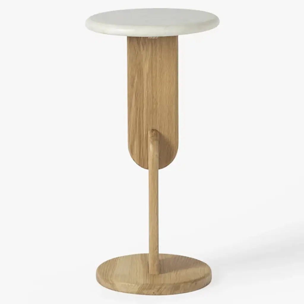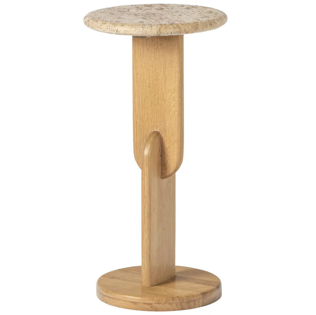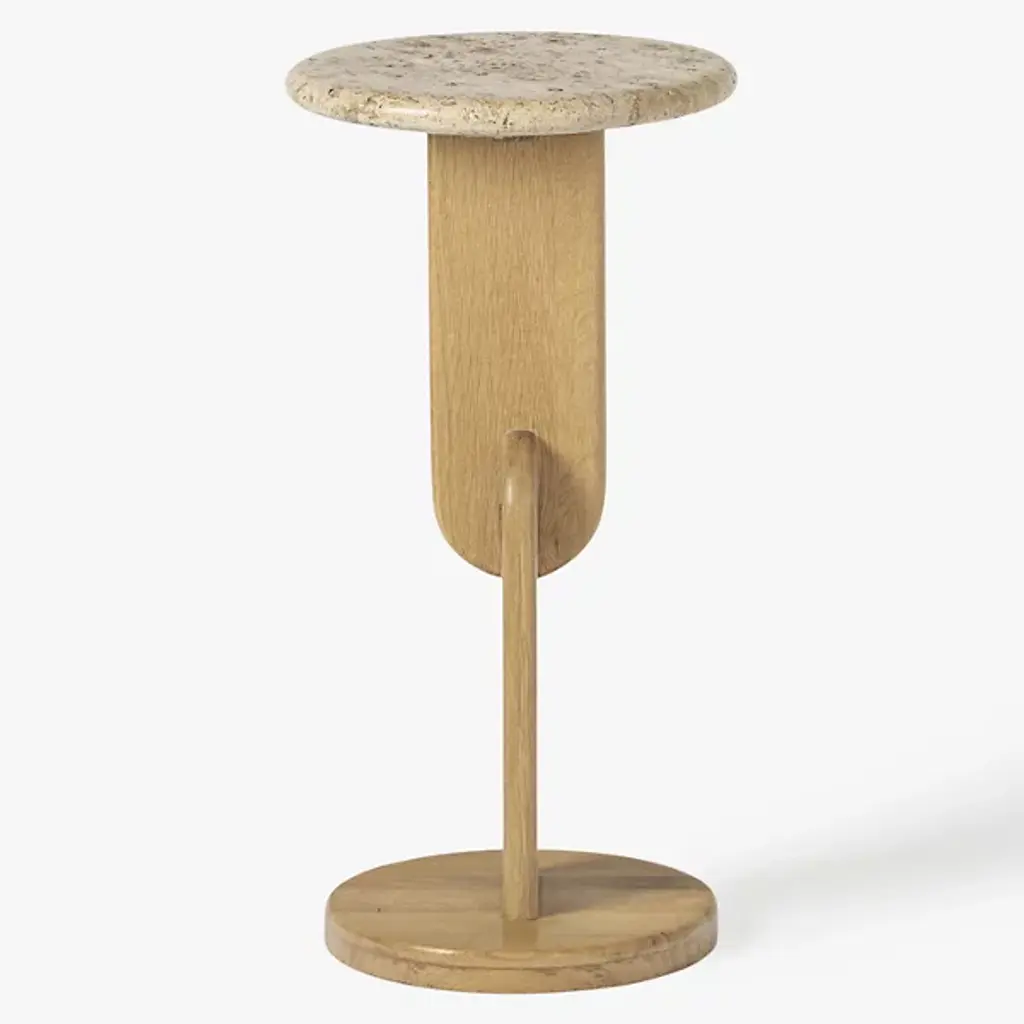 The Hillman Drink Table from Alder & Ore combines the organic warmth of wood with the cool sophistication of marble or travertine, creating a dynamic visual interplay. The table's slender profile belies its strength, offering a stable surface for your favorite libations. Its unique design, featuring a rounded base and circular top, adds a sculptural element to your living space. More than just a resting place for drinks, this table is an art piece that functions brilliantly in modern and eclectic interiors alike.