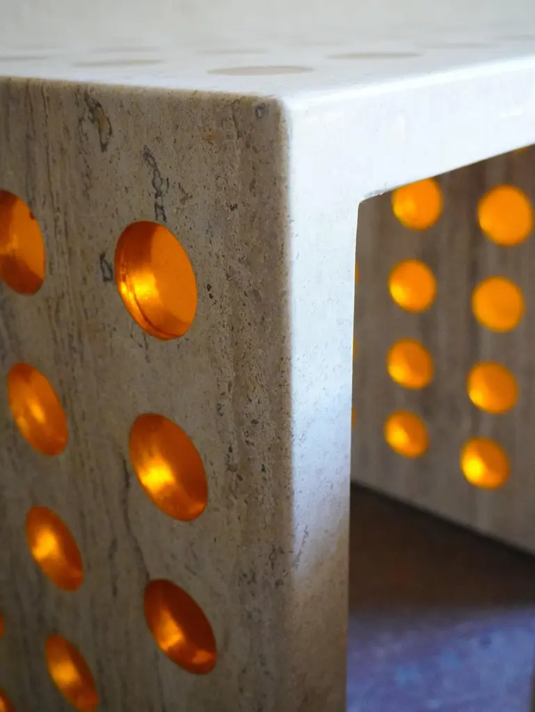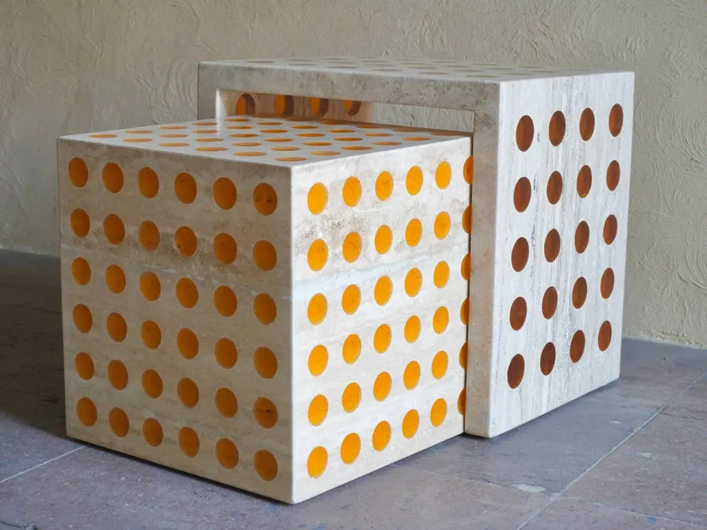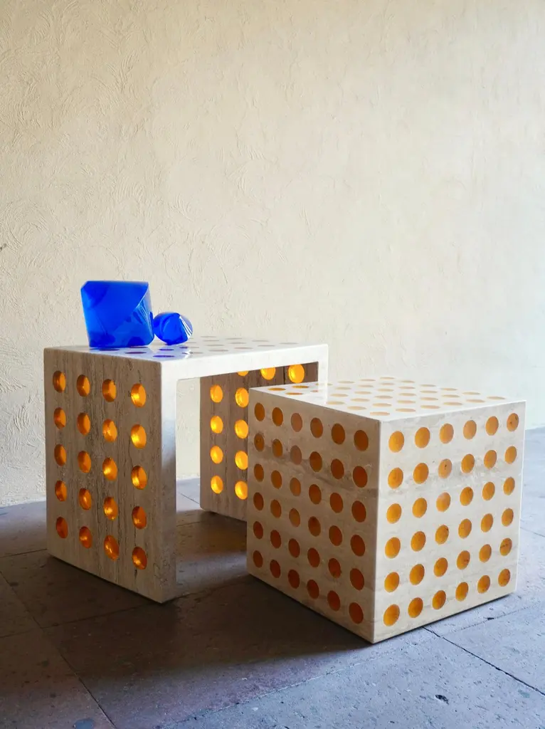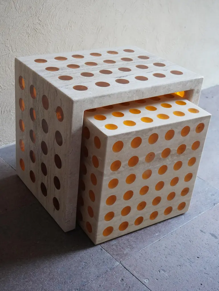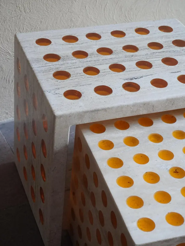 The source of inspiration is the home of the bees called hives. The honeycomb has a very distinctive hexagonal pattern where we can find the honey, its color will depend on the type of nectar the bees are feeding on. We can find honey in various colors such as: yellow, amber, greenish, reddish or even transparent like water.We wanted to give a twist to the pattern of the honeycomb and instead used the circle to create the distinctive pattern. We use travertine marble to represent the color of the beehive wax and translucent resin to symbolize the honey they produce.This tables are surely fun and easy to look and will definitely be an outstanding addition to any space.The small nesting table provides a different level and various layout options.This sculptural tables can also be used as stools.HIVE I: 51 cm L x 40 cm D x 46 cm HHIVE ll (cube): 40 cm L x 40 cm D x 40 cm HWe can custom make the tables to any size.Marble: Available in black or white.Resin: Can be personalized to any color.Please contact us for further information.We are proud of the level of craftsmanship that can be found in our Mexico and we are eager to show it to the world through our work.
