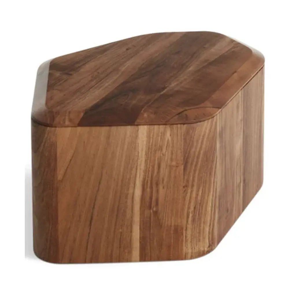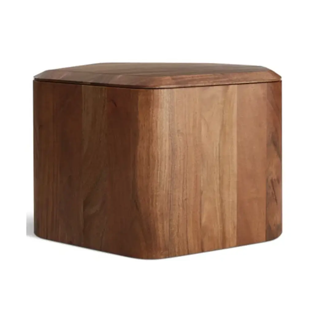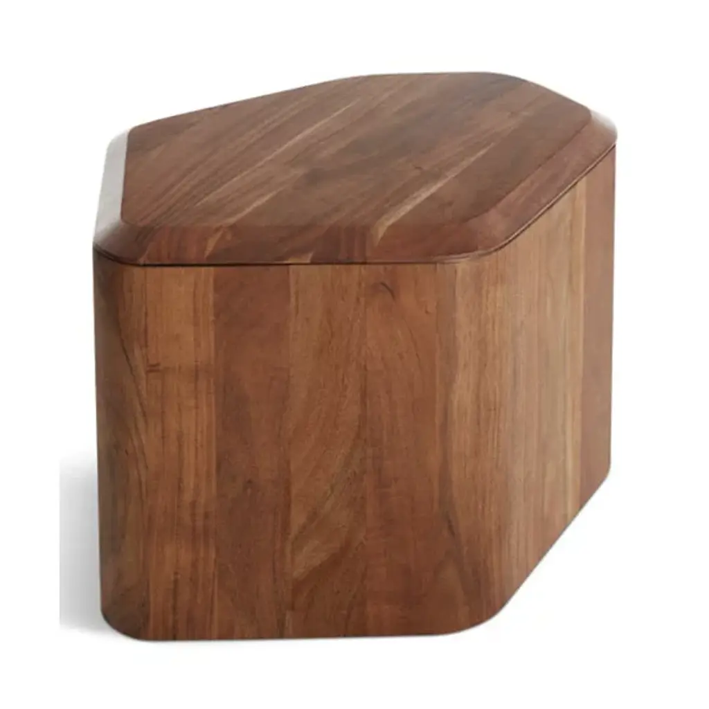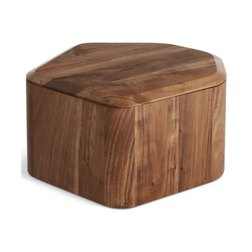 An appealing, functional sculpture, stating that the less is seen, the better. Give blankets, books, or unsightly items a quick, hidden home inside the Hoard Hitch Side Table with Storage from Blu Dot. The table’s simple yet clever design resonates in the contemporary setting. It looks and feels time-tested as a wood construction from top to bottom. Artisans hone the wood into an abstract form whose smooth sides look great as part of a cluster. The tabletop offers a smooth surface for reading materials and refreshments. Removing the tabletop lid reveals a cavity for unseen storage.