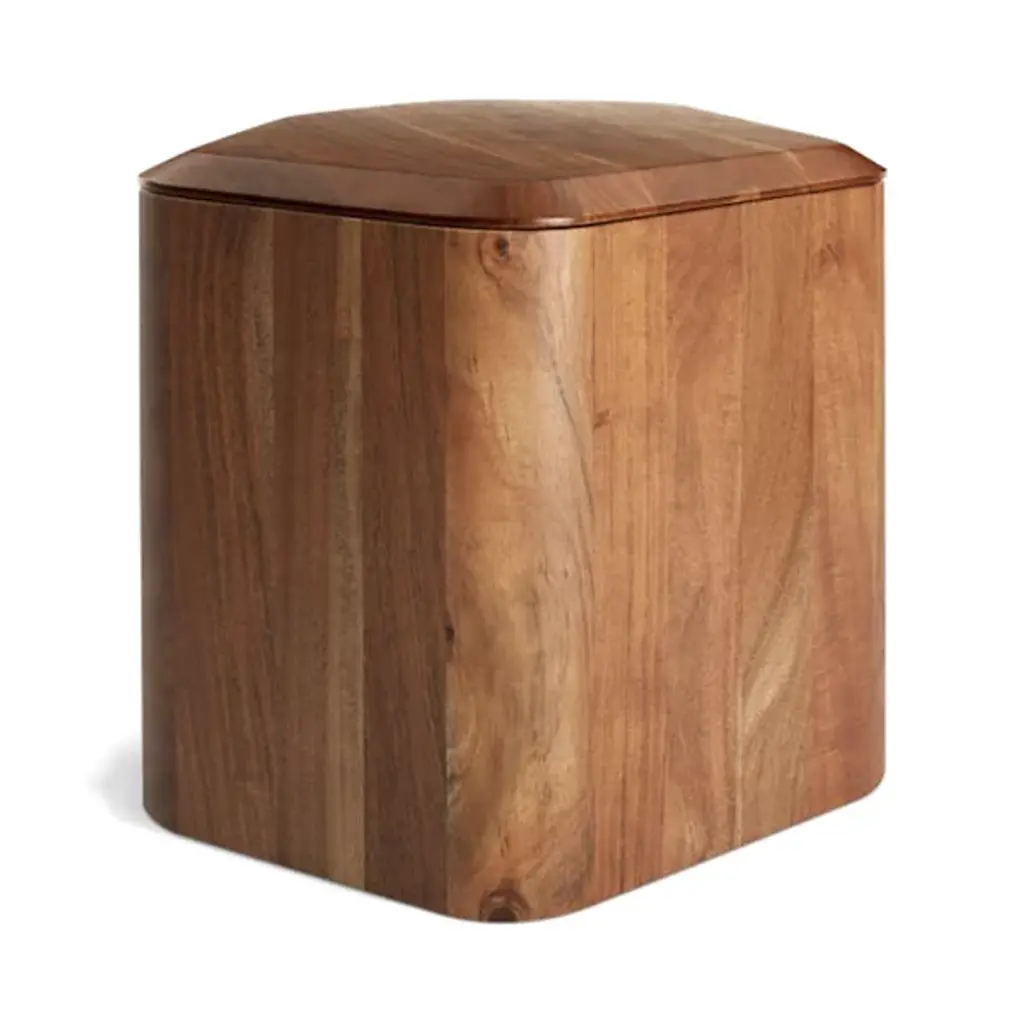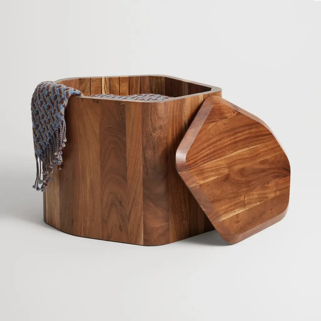 Put a lid on it. Nothing to see here. Solid Acacia wood forms an organic table surface and a clandestine storage space for blankets toys and minor messes. Removable beveled top provides extra polish and panache. Sufficiently lovely on its own or nest with tall and medium sizes for an elegant coffee table cluster. Features