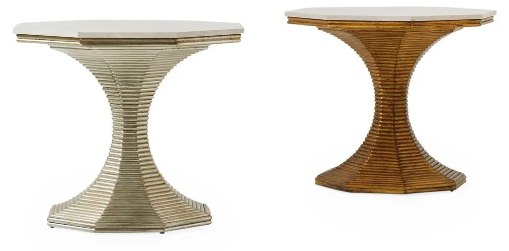 Painstakingly detailed with hand-applied layers of reeded hardwood, this octagonal side table makes an impressive addition to any space. The top is covered with swirling white marble, offering a sleek and chic surface for perching cocktails, objets, and other home accessories.