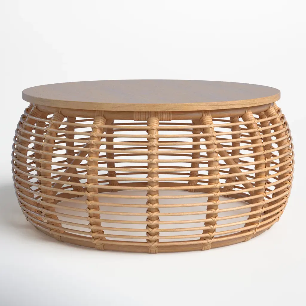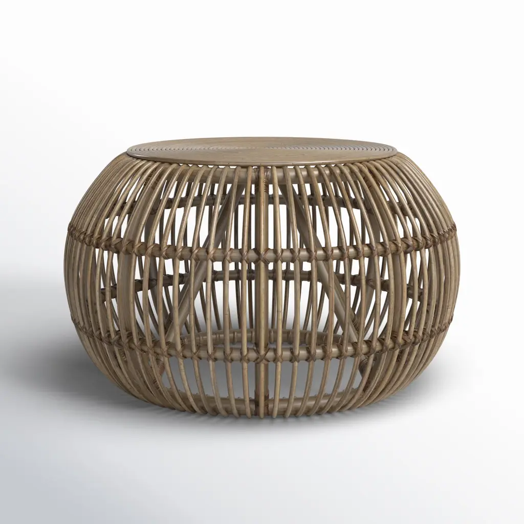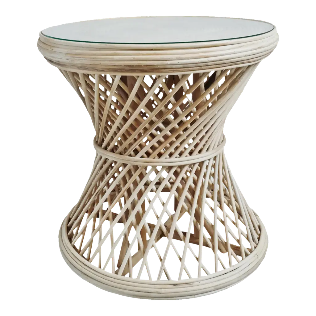Hand woven wicker round hourglass design side table. Includes removable glass top. Each table may have slight variations in natural tones, handmade qualities, and inherent imperfections.