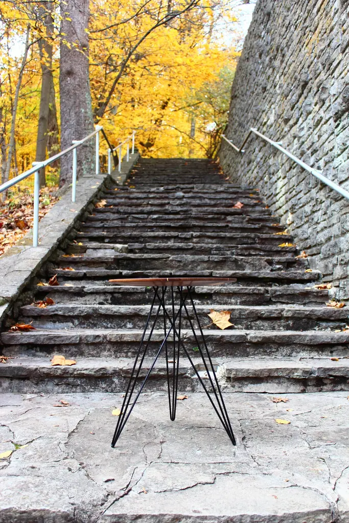 This eye-catching piece combines an industrial structure with sophisticated modern accents. The intersecting metal legs almost seem to play tricks on the eyes and change shape as you circle around the table. It is finished with a slim and elegantly carved wooden tabletop that gently tapers, creating a very thin edge reminiscent of traditional Danish furniture. To top it all of, the tabletop may come with a stunning intersecting diagonal accent inlay that goes completely through the tabletop. The tabletop comes in either solid Walnu, Walnut with Maple inlayed, solid Maple or Maple with a Walnut inlay.