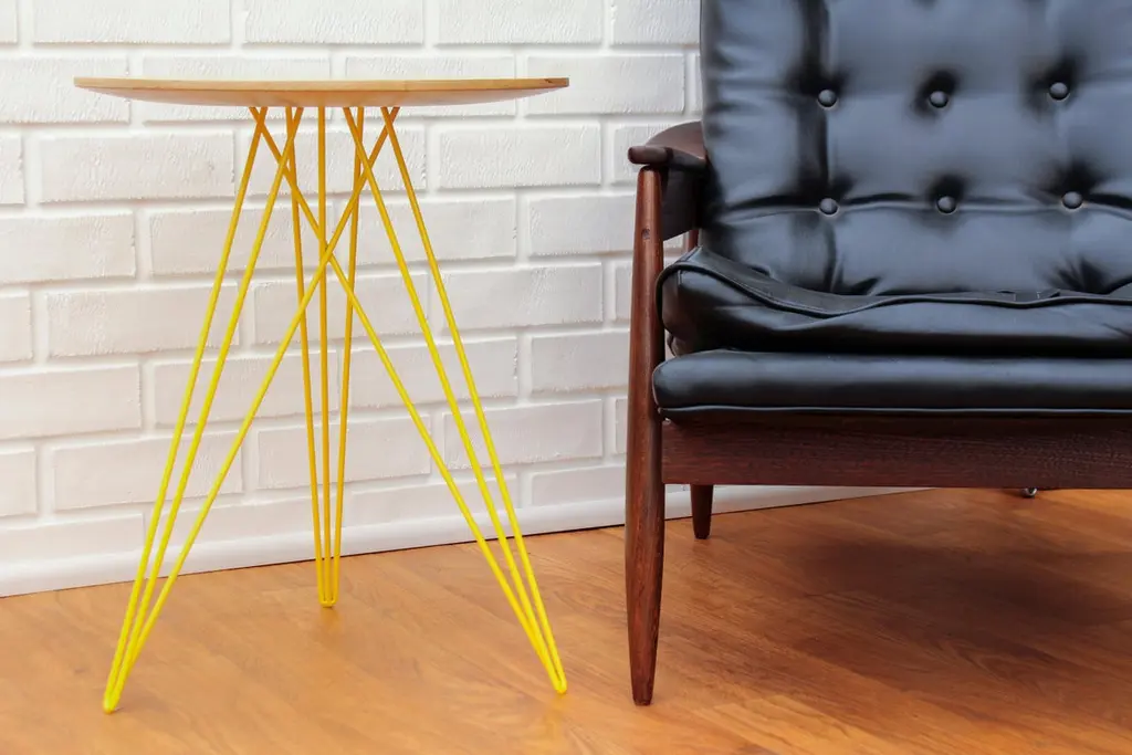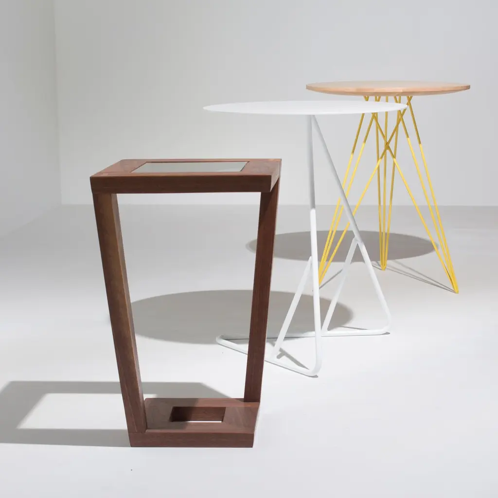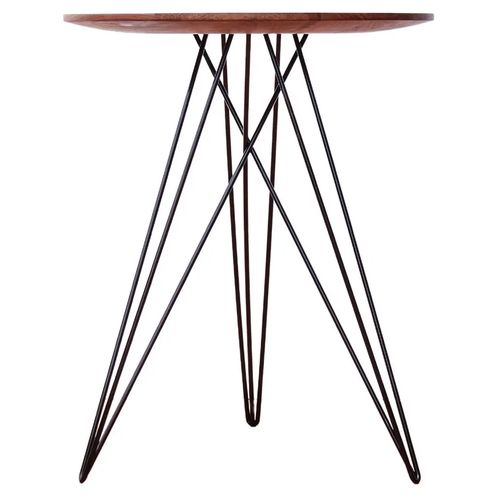 This eye-catching piece combines an industrial structure with sophisticated modern accents. The intersecting metal legs almost seem to play tricks on the eyes and change shape as you circle around the table. It is finished with a slim and elegantly carved wooden tabletop that gently tapers, creating a very thin edge reminiscent of traditional Danish furniture. To top it all of, the tabletop may come with a stunning intersecting diagonal accent inlay that goes completely through the tabletop. The tabletop comes in either solid Walnu, Walnut with Maple inlayed, solid Maple or Maple with a Walnut inlay.