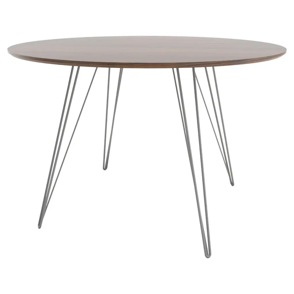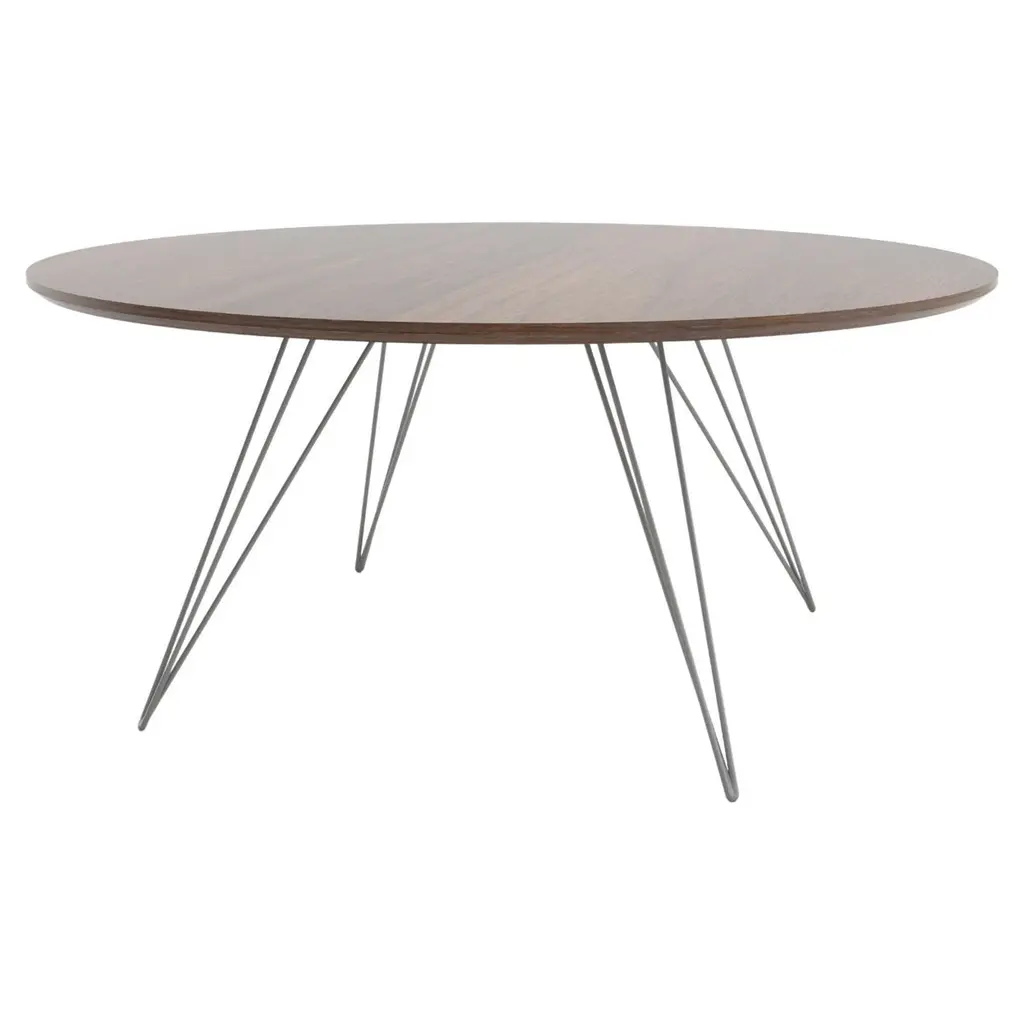 This eye-catching piece combines an industrial structure with sophisticated modern accents. The intersecting metal legs almost seem to play tricks on the eyes and change shape as you circle around the table. It is finished with a slim and elegantly carved wooden tabletop that gently tapers, creating a very thin edge reminiscent of traditional Danish furniture. To top it all of, the tabletop may come with a stunning intersecting diagonal accent inlay that goes completely through the tabletop. The tabletop comes in either solid Walnut, Walnut with Maple inlayed, solid Maple or Maple with a Walnut inlay.