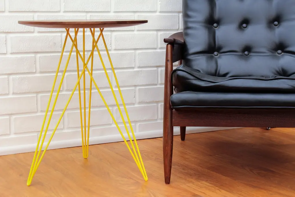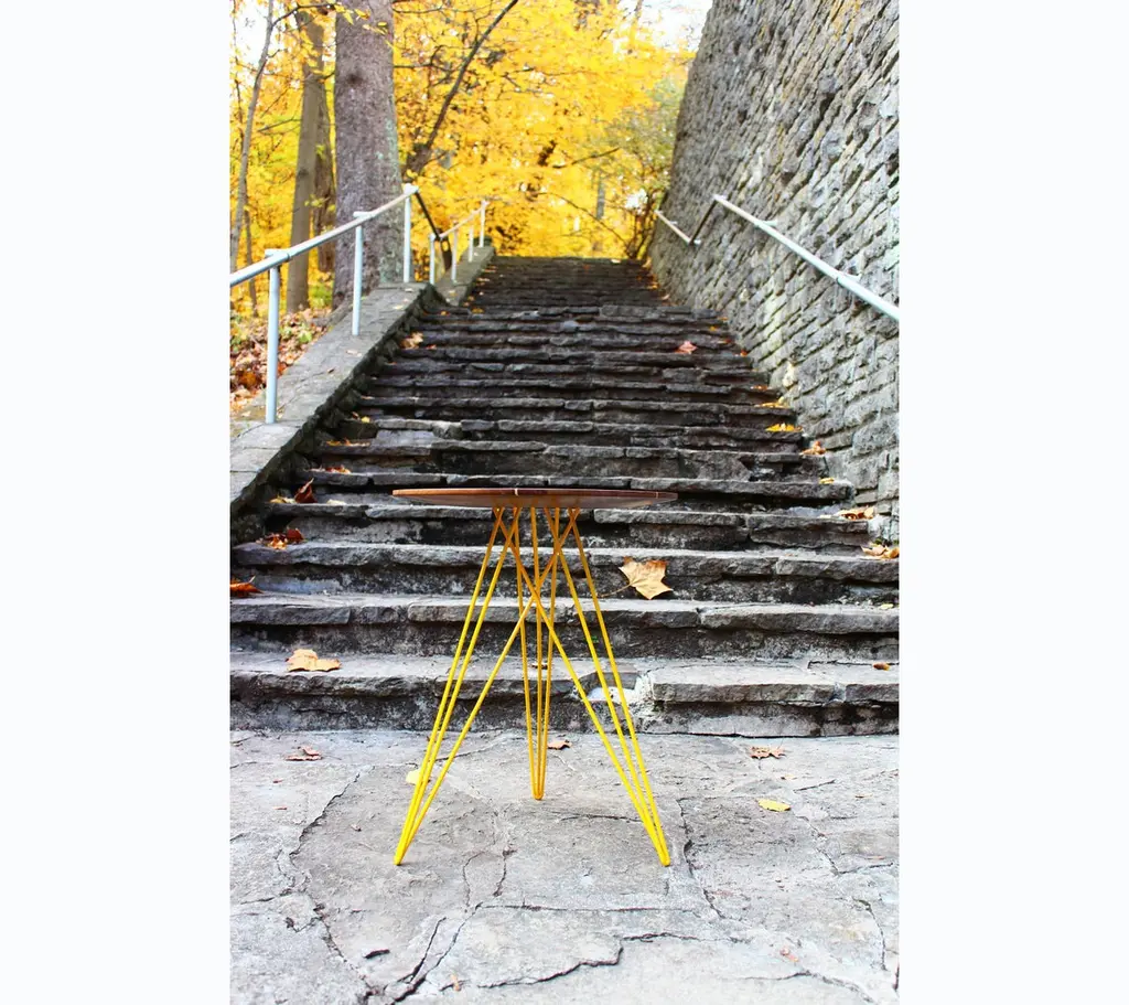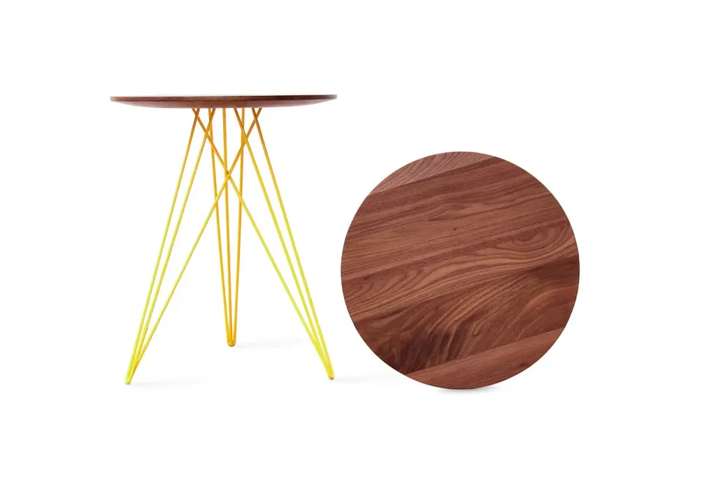 This eye-catching piece combines an industrial structure with sophisticated modern accents. The intersecting metal legs almost seem to play tricks on the eyes and change shape as you circle around the table. It is finished with a slim and elegantly carved wooden tabletop that gently tapers, creating a very thin edge reminiscent of traditional Danish furniture. To top it all of, the tabletop may come with a stunning intersecting diagonal accent inlay that goes completely through the tabletop. The tabletop comes in either solid Walnu, Walnut with Maple inlayed, solid Maple or Maple with a Walnut inlay.