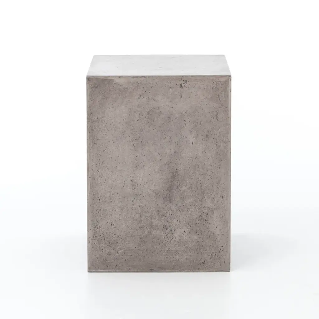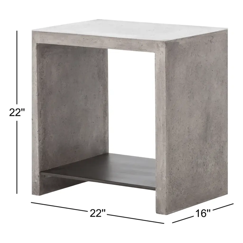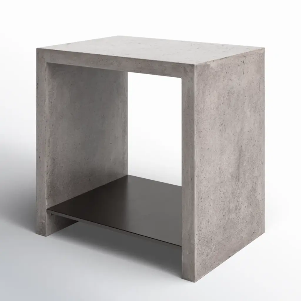 Traditionally outdoor materials are updated for indoor use. A metal shelf seems to float between a minimalist concrete frame for a sleek and industrial-inspired look.