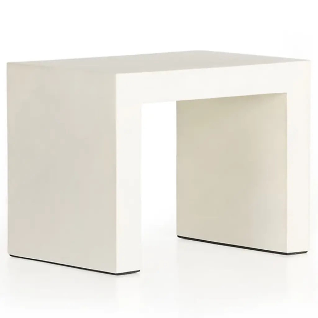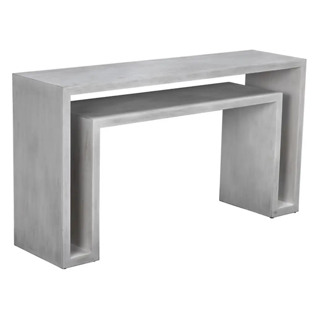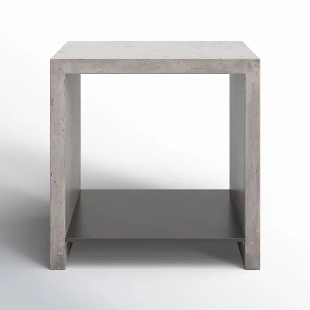 Traditionally outdoor materials are updated for indoor use. A metal shelf seems to float between a minimalist concrete frame for a sleek and industrial-inspired look.