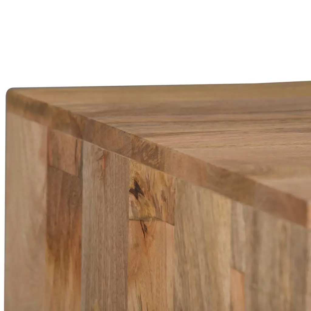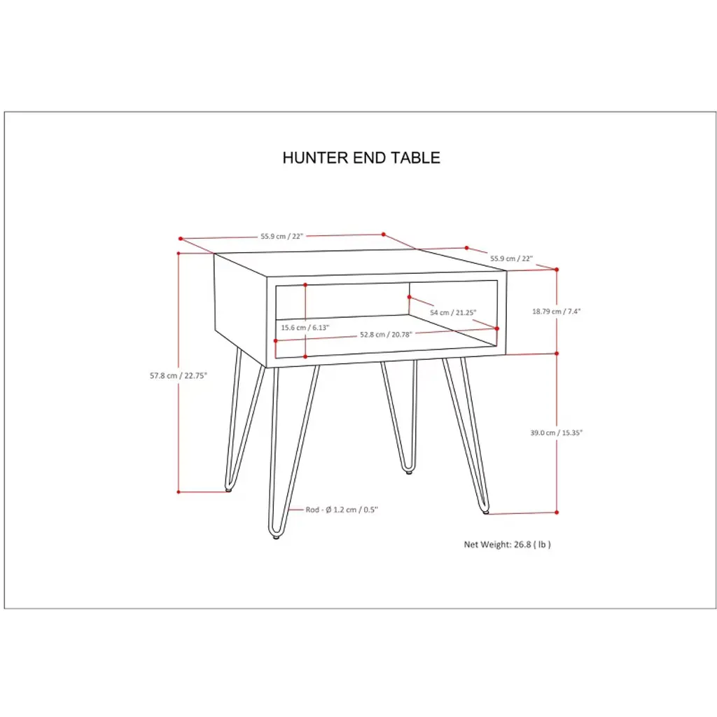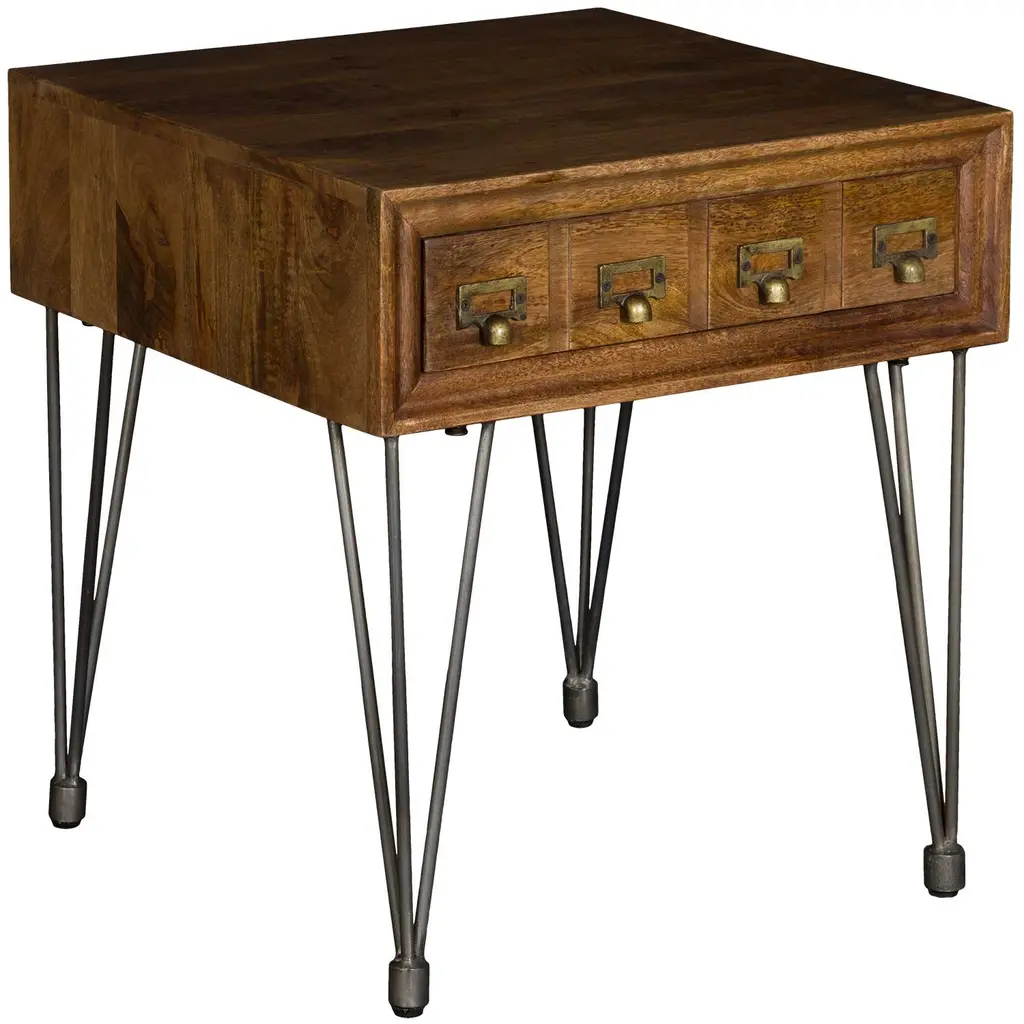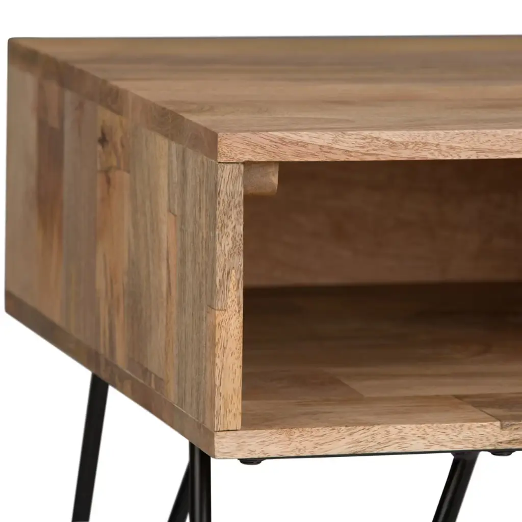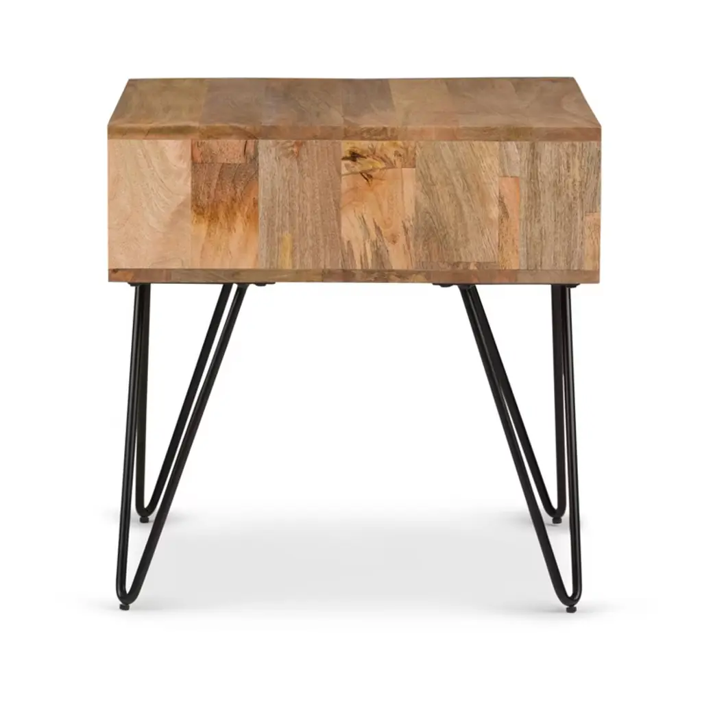 Handcrafted with care using the finest quality Solid Mango Hardwood & MetalHand-finished with a Natural finish and a protective NC lacquer to accentuate and highlight the grain and the uniqueness of each piece of furnitureMultipurpose table can be used as an end table or side table. Looks great in your living room, great room, condo or bedroomFeatures one (1) open compartment for storage and four (4) black iron hairpin legsIndustrial designAssembly Required