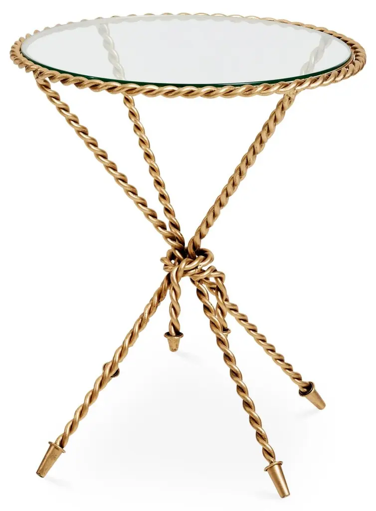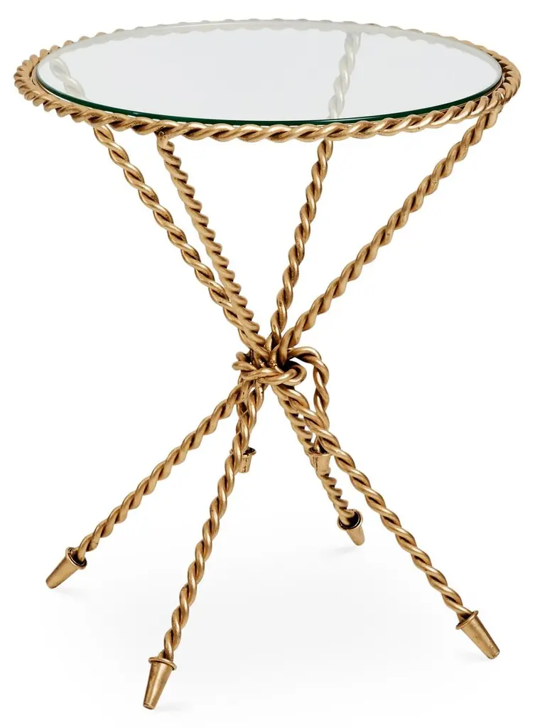 Designed by us and available only at One Kings Lane: Full of refined seaside style, this iron side table shows off twisted rope-like framework and a luxe golden finish. Inset with a clear glass top.