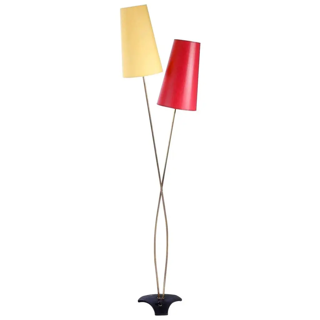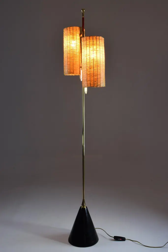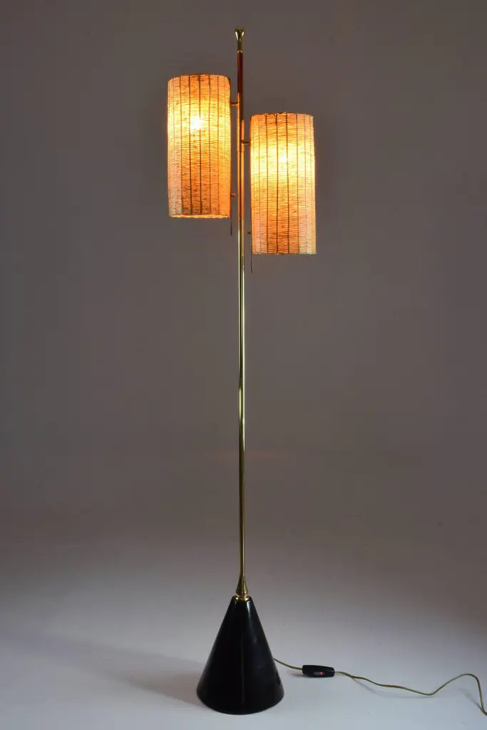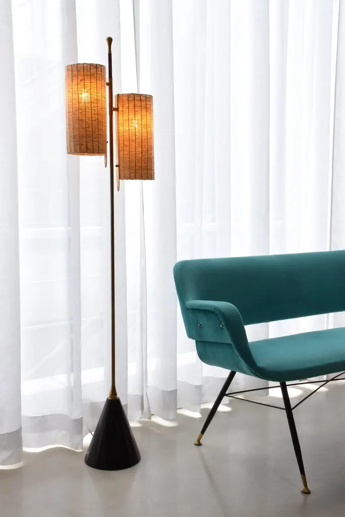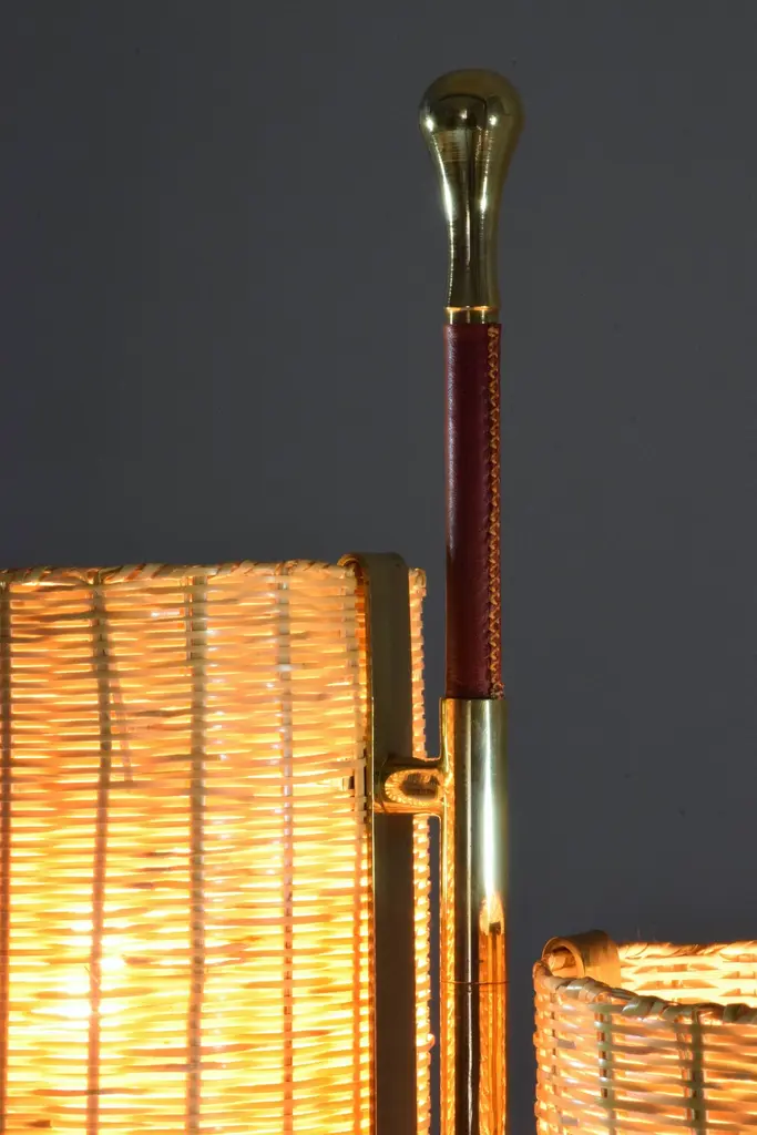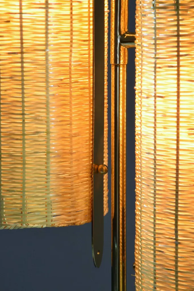 A medium-sized light composed of a solid brass stand adorned with a leather sheathed detail at the top. The long cylinder shades are available in hand-woven wicker or fabric. Option to choose between a black, white or green marble base.2x60 W Max E14230 V - LED Integrated 120 V - LEDThe Flow collection is designed by Jonathan Amar composed of artisanal articulating lamps and side tables following three years of research and development between his office in Paris and his atelier in Rabat and Leiria Portugal. It represents 35 years of passion and know-how in the fields of decorative arts and interior design.