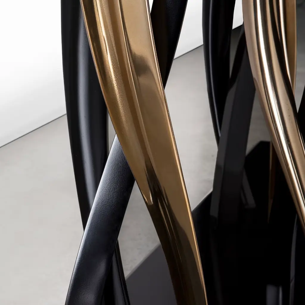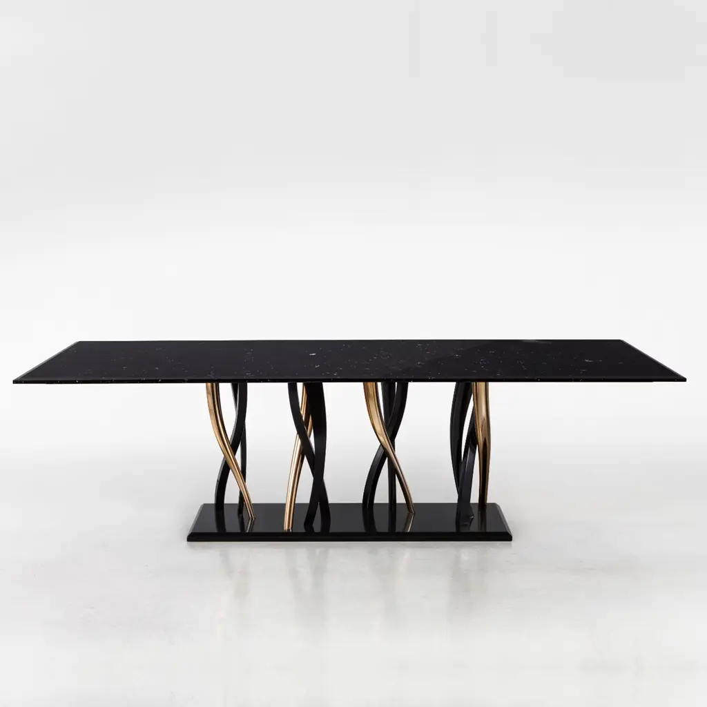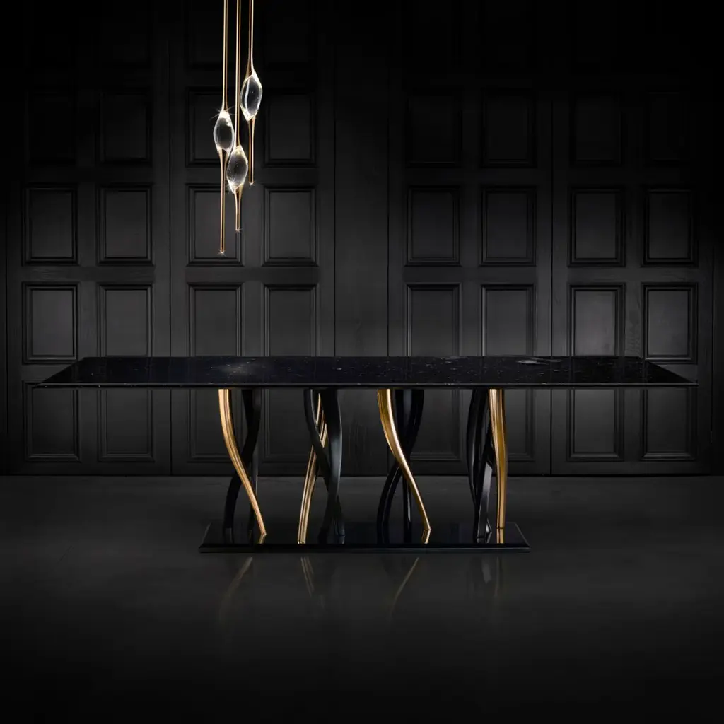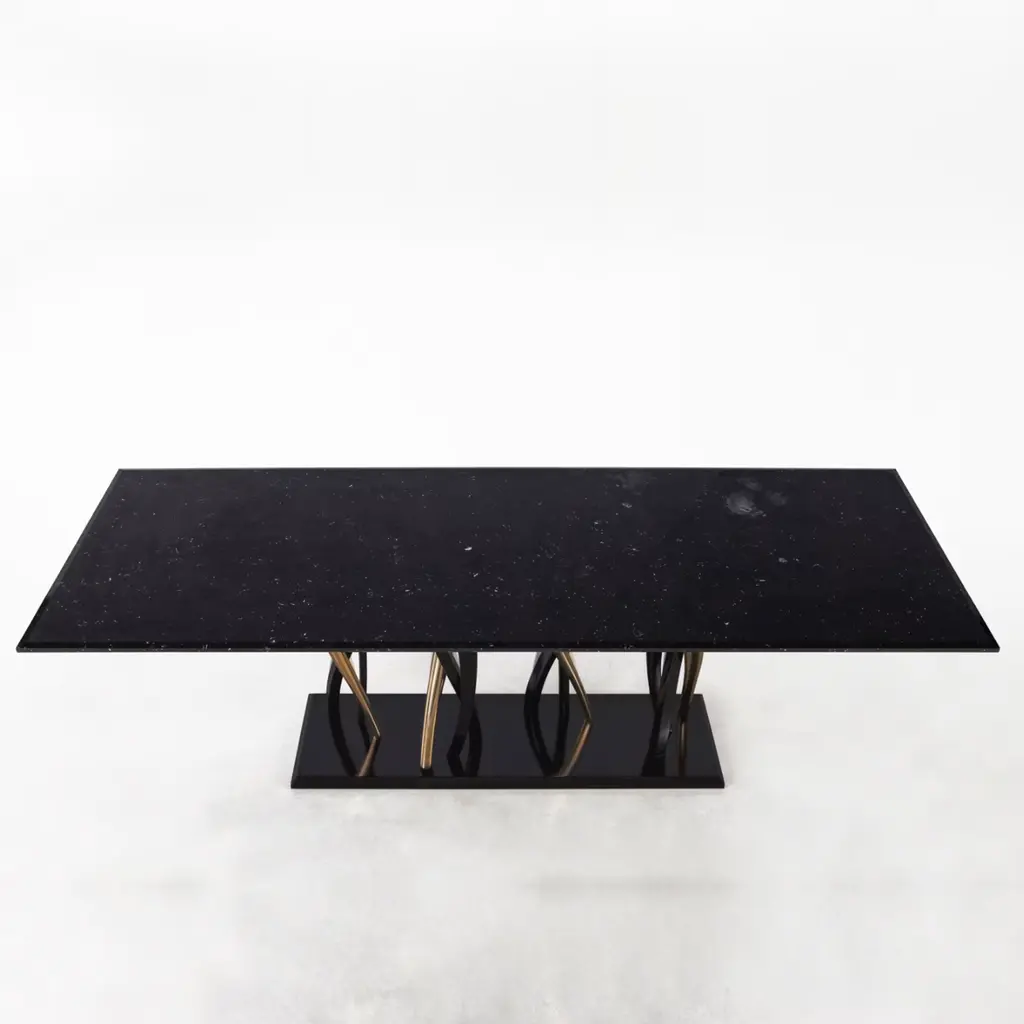 A sparkling forest of legs support a majestic block of marble. Il Pezzo 8 Marble Table shows its black and gold colors as an eclectic, elegant match you can loose yourself in. The tabletop is made of a thin slab, or two mirrored slabs, of polished Marquinia marble; the legs are made of casting, in black and gold finishes. A small brass cylinder inserted in every piece, containing serial number, seals the authenticity and uniqueness. Available in custom sizes and finishes.