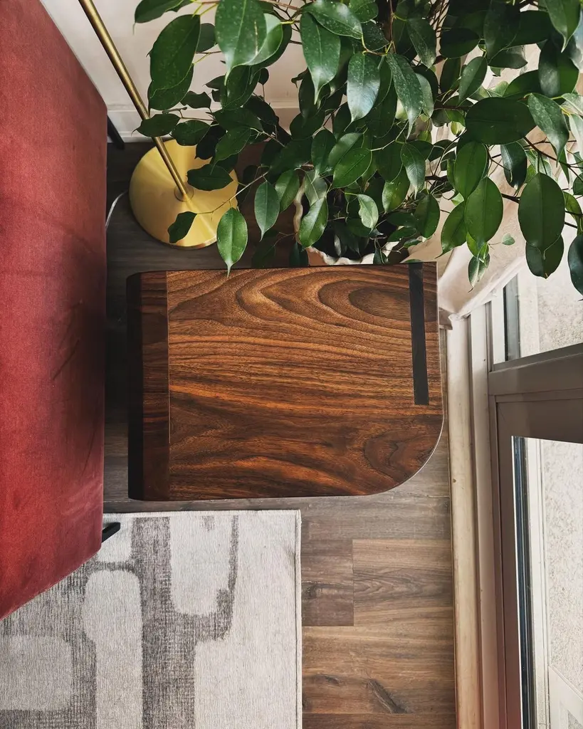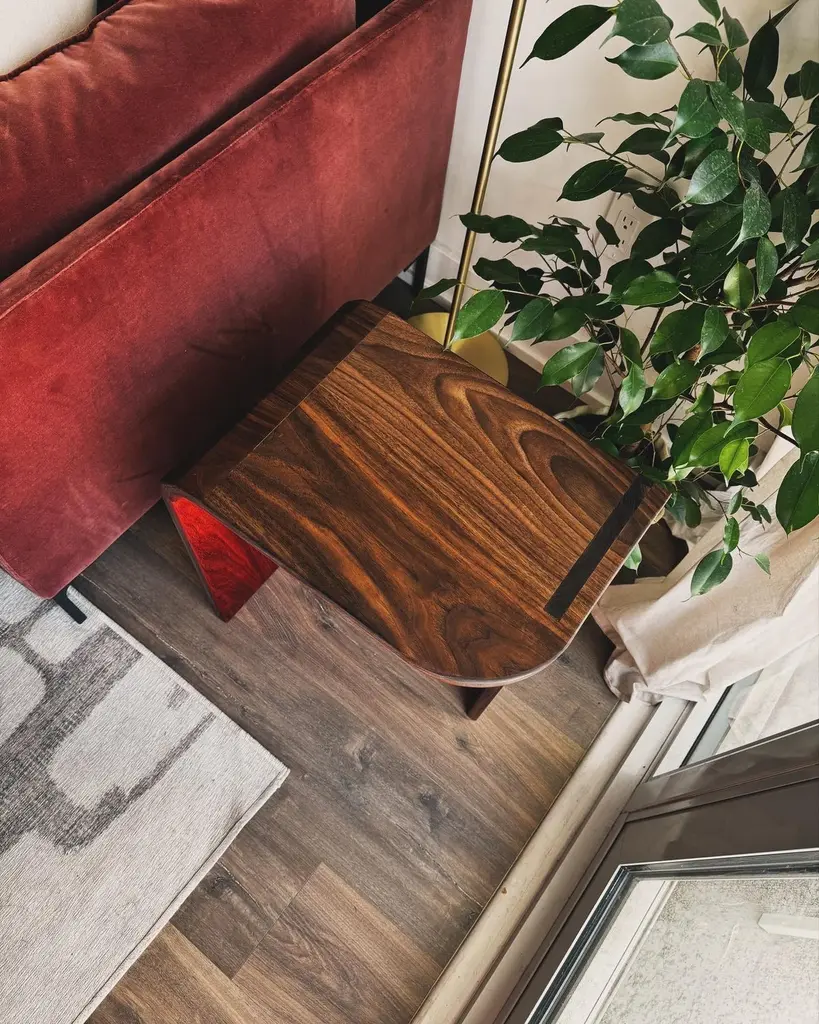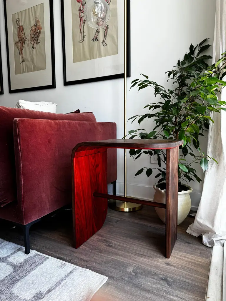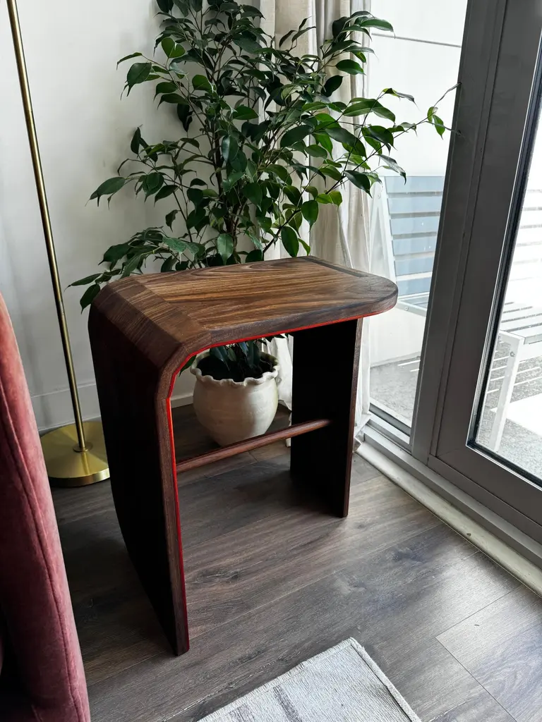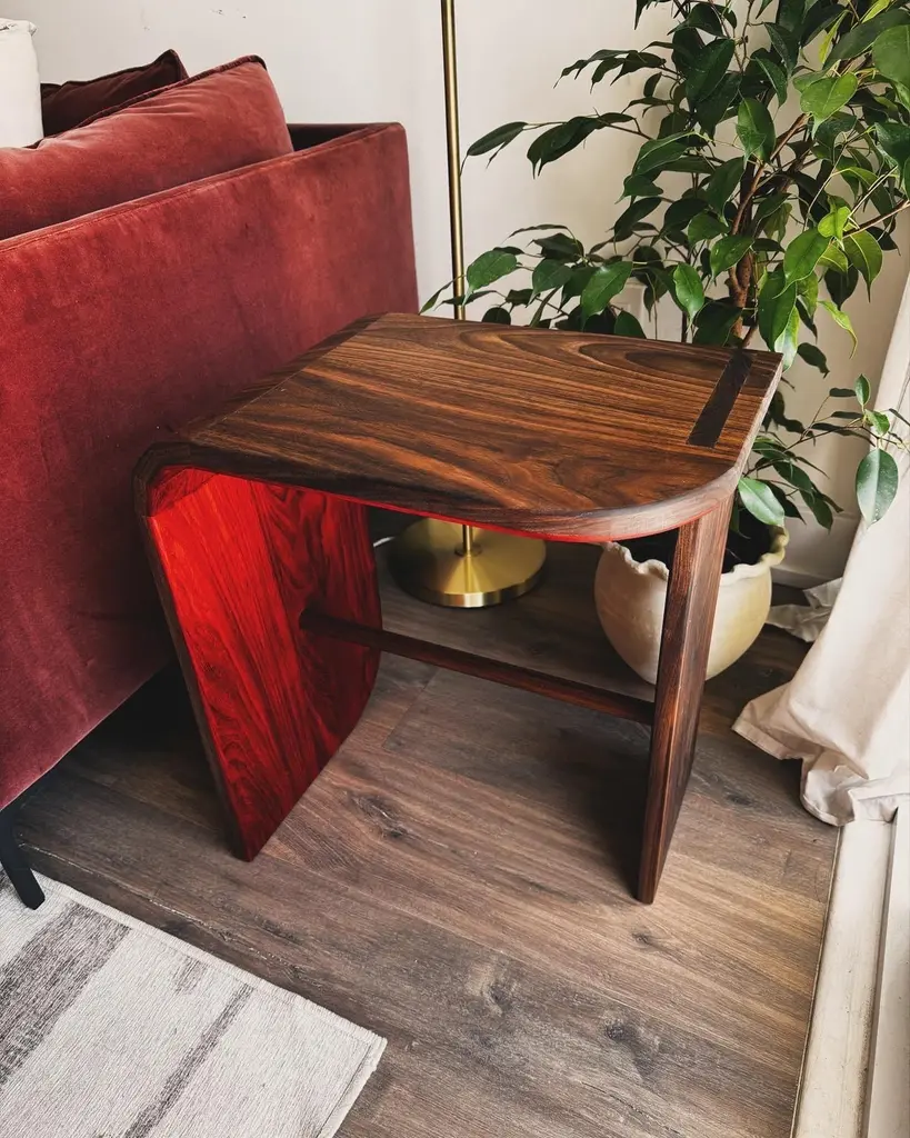 Introducing a piece that marries the warmth of walnut with the exotic flair of Padauk: our Walnut Side Table with Padauk Bottom. Designed to nestle beside your favorite armchair or sofa, this side table is a statement in craftsmanship and design. The rich walnut top, with its distinctive grain, offers a sturdy and elegant surface, while the vivid Padauk shelf at the bottom adds a bold contrast and a hint of the avant-garde. Its smooth, rounded edges and clean lines present a modern aesthetic that complements any decor. Ideal for holding a stack of books or a striking lamp, this table not only serves a functional purpose but also acts as a showcase for the natural beauty of wood.