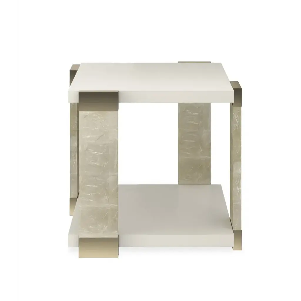 This square end table brings a beautiful balance of linear forms and light. Its Almond Milk tabletop and shelf appear to float within Oracle wood posts, for a look that stirs interest, without imposing. Whisper of Gold metal accents trim the top and bottom of each post to create shimmer and moments for reflection.
