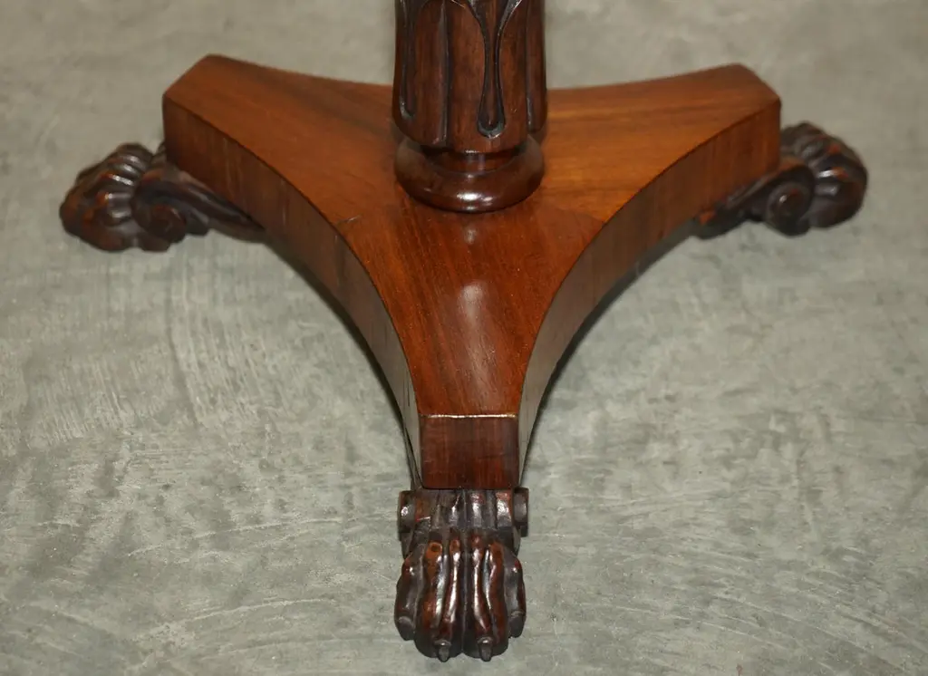 We are delighted to offer for sale this exquisitely carved Antique circa 1830 William IV Mahogany side occasional table.A very good looking well-made and decorative piece in original condition, the timber patina is glorious, the column has a beautifully carved middle to bottom which is feathered all around, it is exquisite. This has been fully restored by my French polisher, it has been washed back then French polished from the ground up, he always keeps all the original wear and patina as its right and proves the the age and genuine useDimensionsHeight:- 68cmWidth:- 49cmDepth:- 49cmPlease note all measurements are taken at the widest point.This item is available for collection from our Pulborough warehouses.ConditionPlease view the very detailed pictures as they form part of the description pertaining to the condition. Please note vintage period and original items such as leather seating will always have natural patina in the form of creasing and wear, we recommend annual waxing to ensure no moisture is lost, also hand dyed leather is not recommended to sit in direct sunlight for prolonged periods of time as it will dry out and fade.