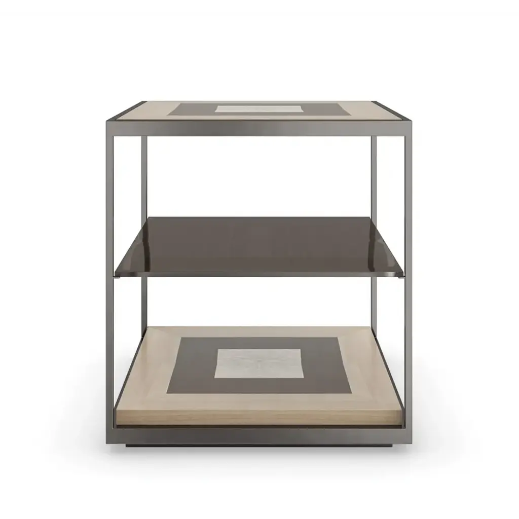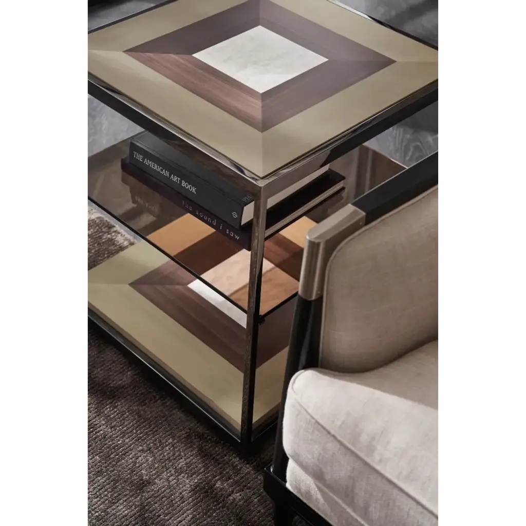 With a captivating geometric pattern, this end table adds depth and unique perspective to living interiors. Intricately pieced veneers in a mix of Dyed Tupelo, Japanese Sen and Madrona Burl tie the table to our Escher chest and Illusion cocktail table, celebrating the time-honored art of parquetry. Features a removable tempered glass shelf in Smoked Bronze for further reflection and functionality.