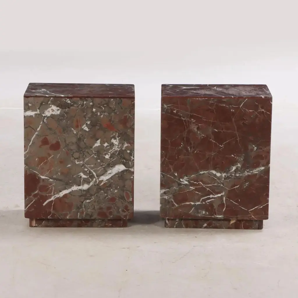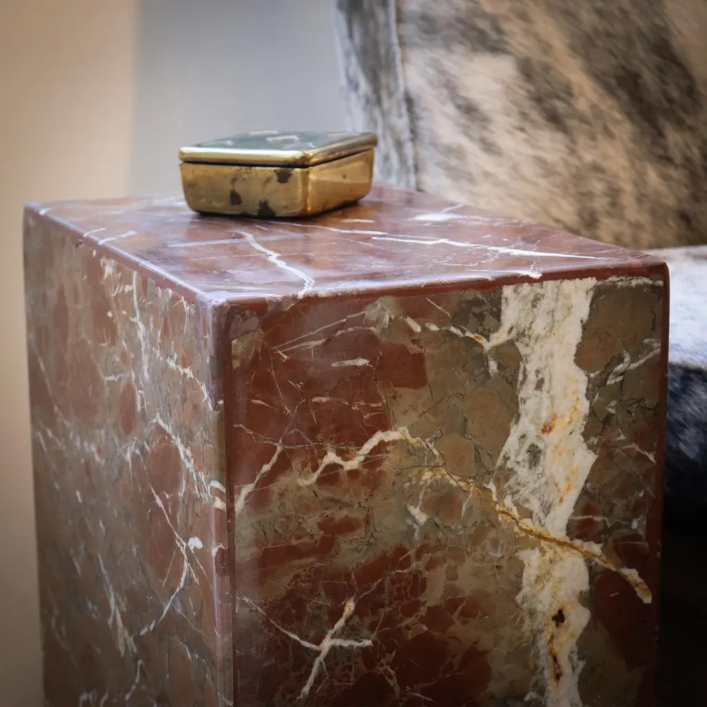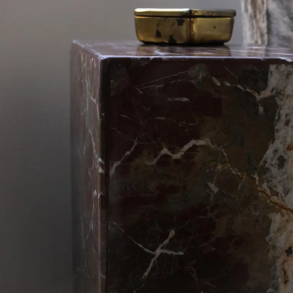 A sculptural statement of pure materiality, this vintage pillar table in Rosso Levanto marble is a rare find for the Lemieux Et Cie Collection. With its deep oxblood hues and intricate artistic veining, the stone’s rich geological history is on full display, exuding both strength and beauty. The monolithic form lends itself to a myriad of uses—pedestal, side table, or striking standalone piece—bringing an artful presence to any interior. A true collector’s piece, with the timeless design of European modernism.Priced individually.