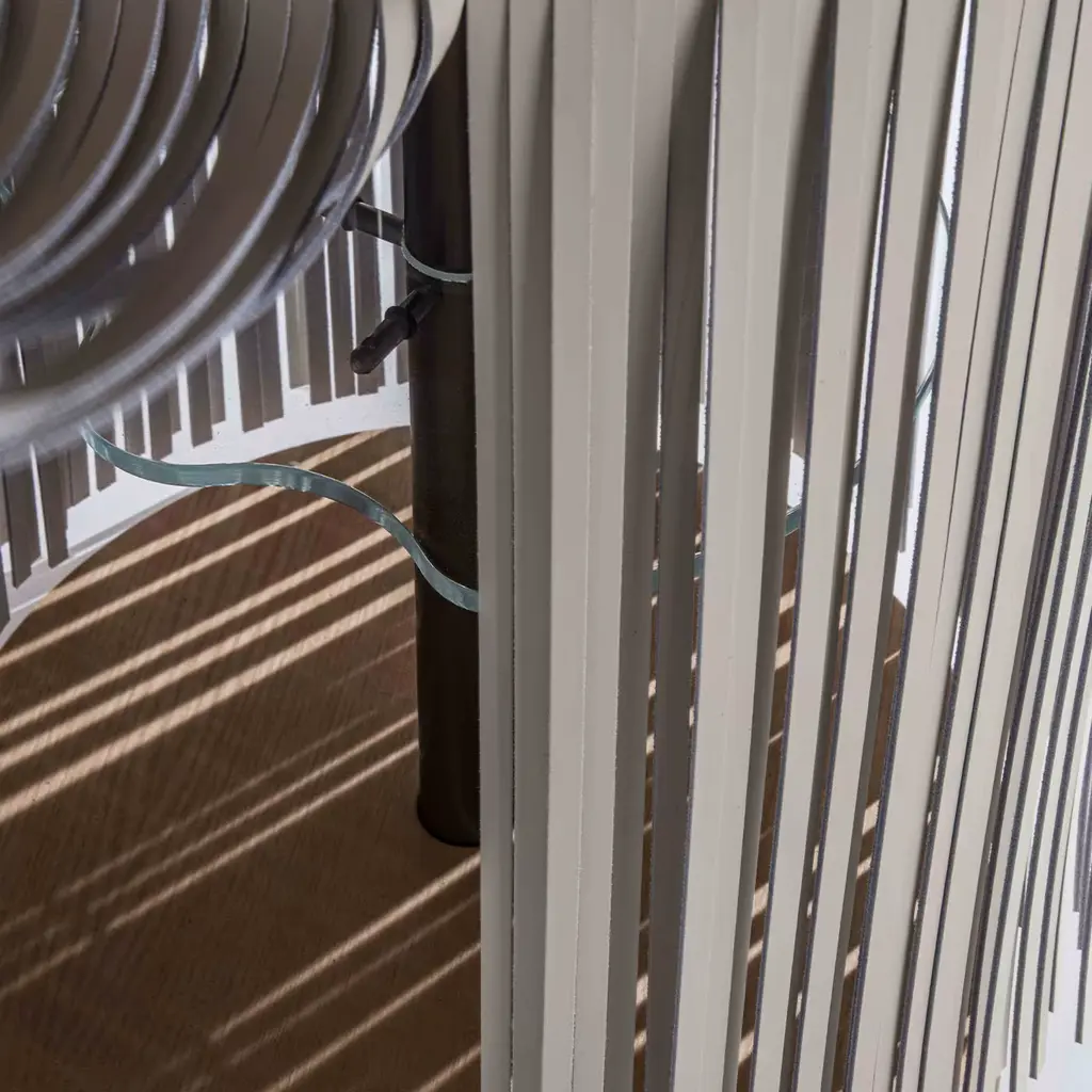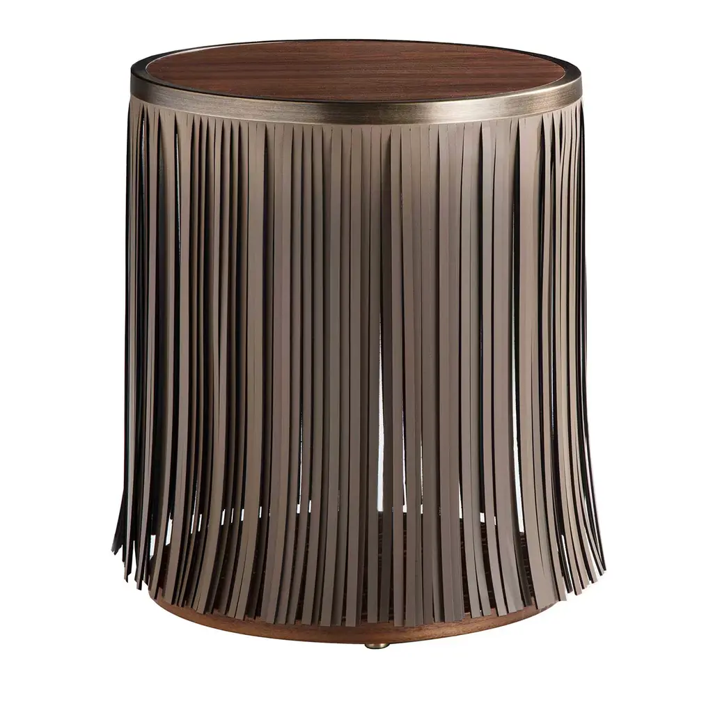 A glamorous design that will not go unnoticed, this side table boasts hundreds of little ivory-toned leather strips skillfully layered around the satin brass frame to achieve a look that works wonderfully in contemporary interior decors. Featuring an ash wood round top and base, this unique design can be accessorized with an LED panel with sensor ignition and an invisible wireless battery charging for electronic devices integrated into the wooden top. Available also in Canaletto walnut wood and a wide choice of leather colors.