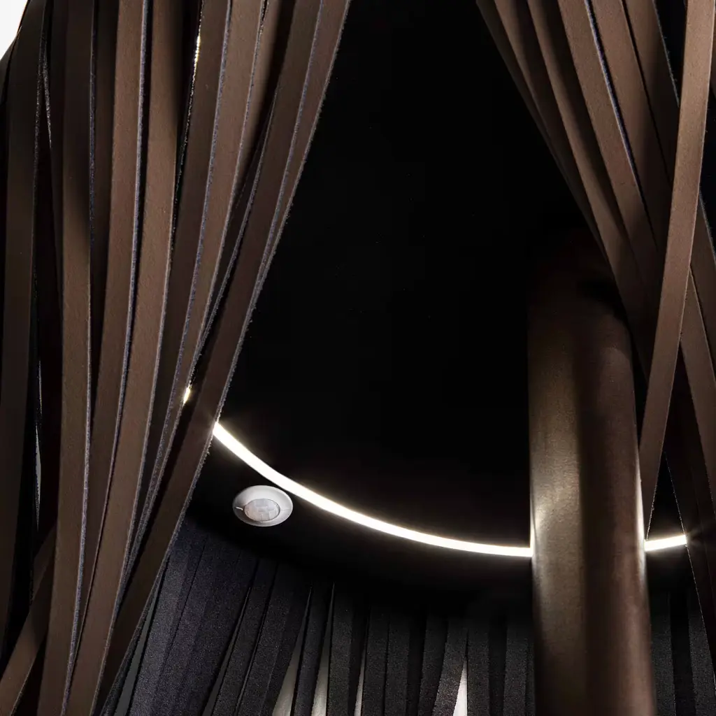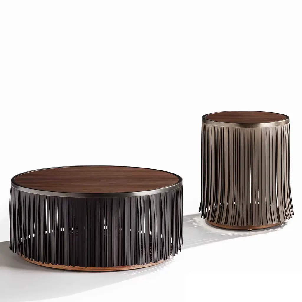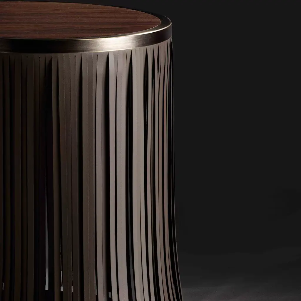 Ringed in brushed brass, the round Canaletto walnut wood top and base of this exquisite side table are graced by a glamorous silver-gray leather fringe that will make a spectacular statement in both minimalist and rustic interiors. A display of unparalleled artistry, each table from the Indian Collection is crafted to the highest standards. Optional features such as an LED panel with sensor ignition and an invisible wireless battery charging for electronic devices integrated into the wooden top can be added upon request.