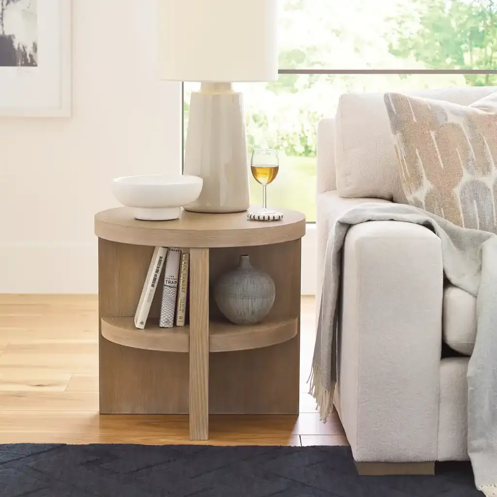 The Round End Table from the Indiya collection combines sleek design with functional storage. Crafted from quartered ash veneers, it showcases a rich wood grain that adds warmth and character to any space. With four spacious shelves, this table offers ample room for display and organization, making it a versatile addition to both modern and traditional interiors. Its refined craftsmanship and balanced proportions ensure it serves as both a stylish accent and a practical solution for everyday living.