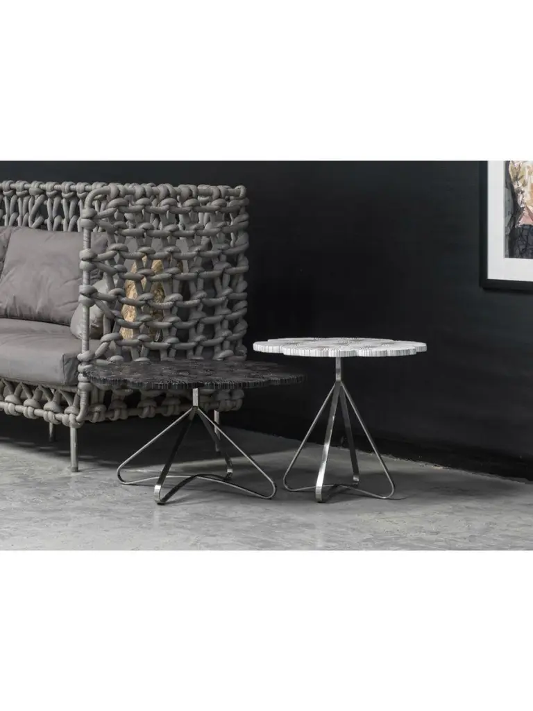 Bouquet end table by Kenneth Cobonpue.Materials: Fiberglass reinforced polymer and stainless steel.Dimensions: Diameter 55cm x height 50cm.An exquisitely eye-catching centerpiece, Bouquet makes any day feel like a special occasion. The delicate lines of the signature floral relief pattern complete the contrasting resin top and stainless steel base. Designer's BiographyKenneth Cobonpue is a multi-awarded furniture designer and manufacturer from Cebu, Philippines. His passage to design began in 1987, studying Industrial Design at the Pratt Institute in New York. While completing his studies, he apprenticed for a leather and wood workshop near Florence, Italy. He went on to study Furniture Marketing and Production at the Export-Akademie Baden-Württemberg in Reutlingen, Germany, under a private and state scholarship program, and subsequently worked in Bielefeld and Munich.Kenneth returned home to Cebu in 1996 to manage Interior Crafts of the Islands, Inc., a furniture design and manufacturing company founded by his mother Betty Cobonpue in 1972. Discovering that modern design could have a new face using natural fibers and materials, Kenneth created pieces of functional art, offering an alternative to the Western definition of modern design. Today, the Kennethcobonpue brand has become known globally for its unique designs and extensive roster of clientele, including Hollywood celebrities and members of royalty.With his masterful way of integrating nature, traditional craft and innovative technologies, designer and creative director Kenneth Cobonpue has earned international awards and recognition for his creative, organic, and expressive pieces. Working closely with some of the world’s leading designers, from household names to emerging talents, Kenneth has been pushing the envelope for design in the Philippines and sharing his vision to a global audience. Awards to his credit include five Japan Good Design Awards, the grand prize at Singapore International Design Competition, the Design for Asia Award of Hong Kong, the American Society of Interior Design Top Pick selection and the French Coup de Coeur award. Several of his designs were selected for several editions of the International Design Yearbook published in London and New York. Phaidon’s book entitled “& FORK” underscores Kenneth’s position as a leader of a new movement incorporating new technologies with crafts. In 2007, TIME magazine called him “rattan’s first virtuoso”. Kenneth was named the Designer of the Year in the first edition of Maison et Objet Asia held in March 2014 in Singapore.Kenneth reveals new work each year in the design shows from Milan to New York, and he speaks regularly about Southeast Asian design all over the world. He has also appeared in European television and in countless international magazines and newspapers around the world. Various Cobonpue designs have also appeared in full-length feature films and television, such as Oceans 13 and CSI.