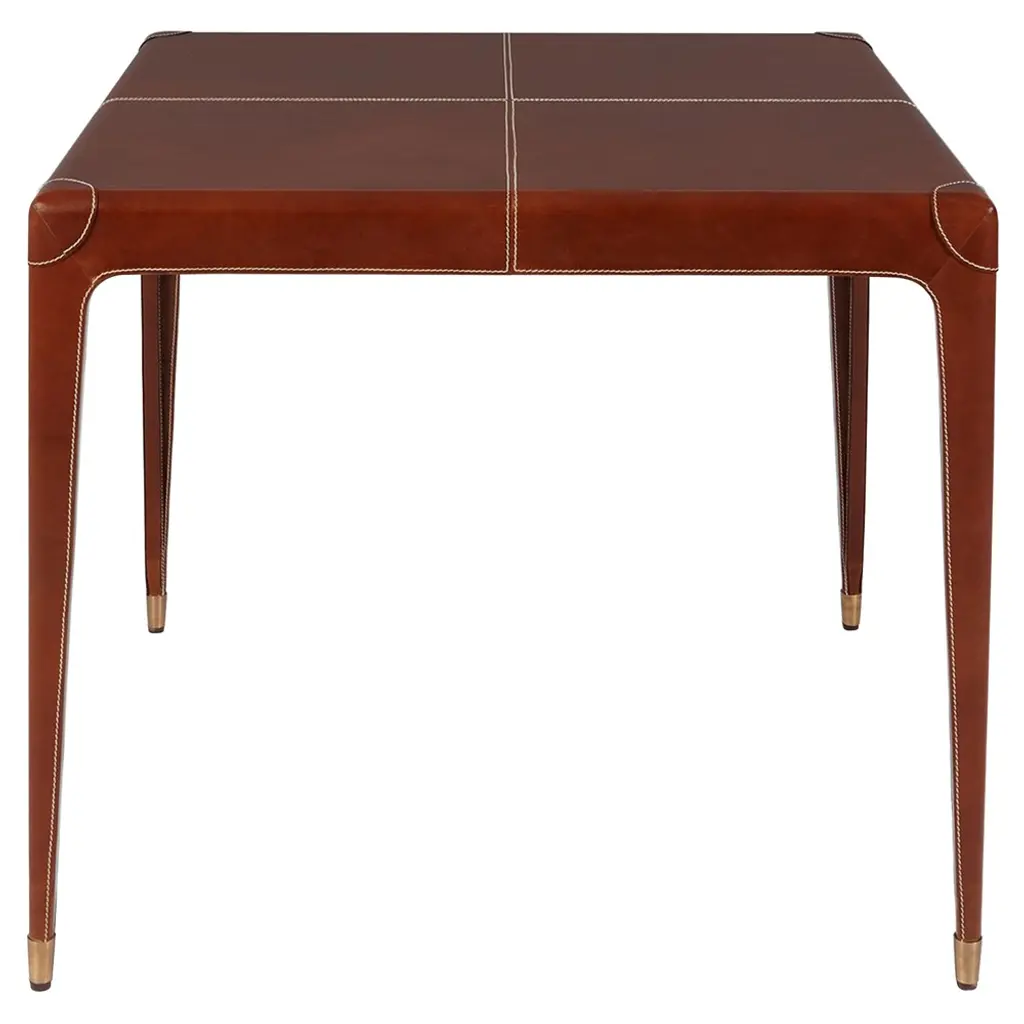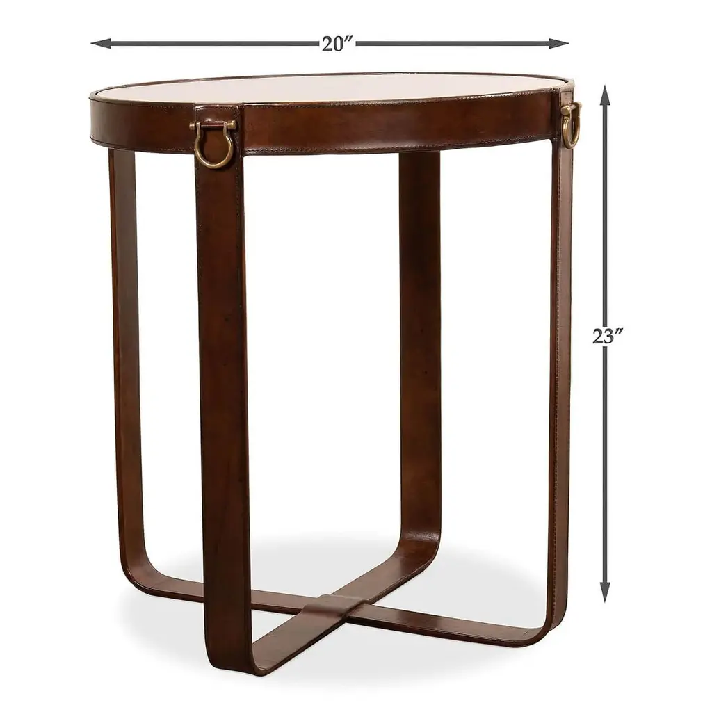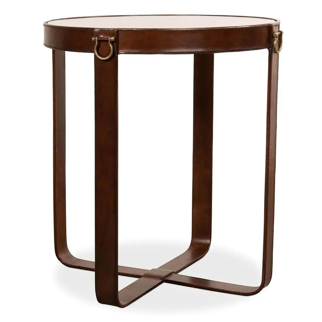 An Industrial round leather and glass end table. This table has an equestrian-inspired design. The top is glass and is supported by four legs wrapped in leather with stitching and brass accents. Dimensions: 20" W x 20" D x 23" H.