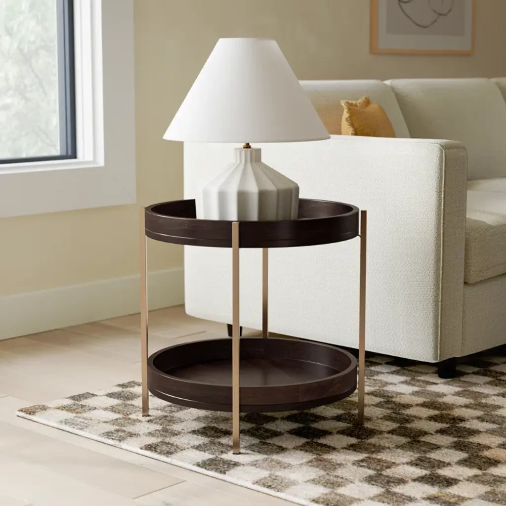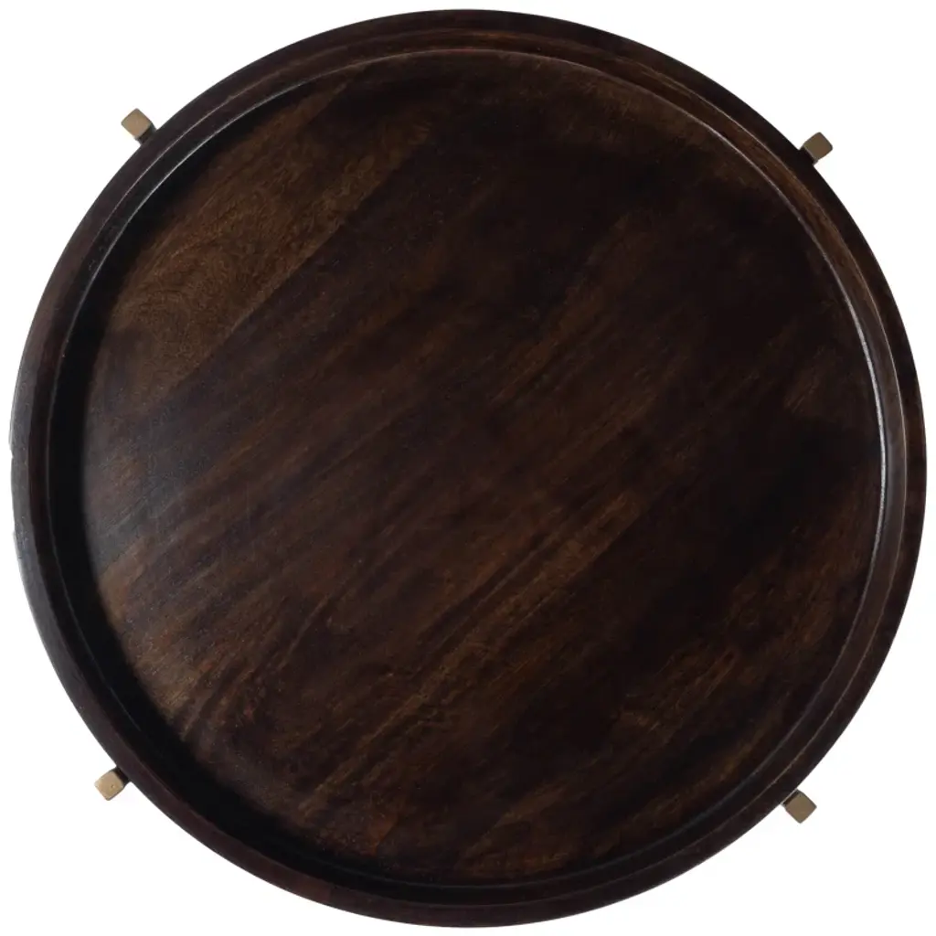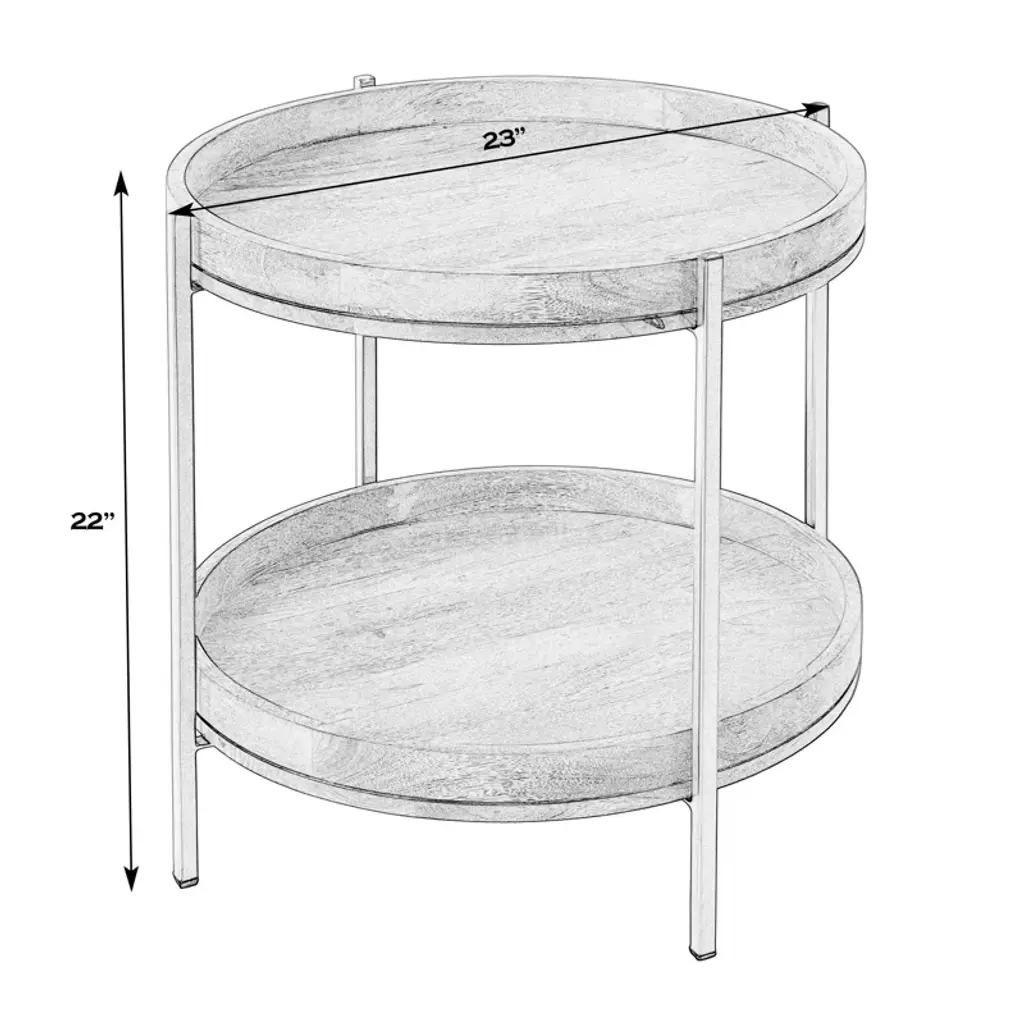 This stunning round accent table effortlessly combines modern design with natural beauty. Crafted from eco-friendly Mango wood, it offers a warm and inviting surface to display your favorite treasures. With its sleek metal legs and rich wood grain, each piece is unique, showcasing the distinct character of the mango wood, making it a true statement in any room.