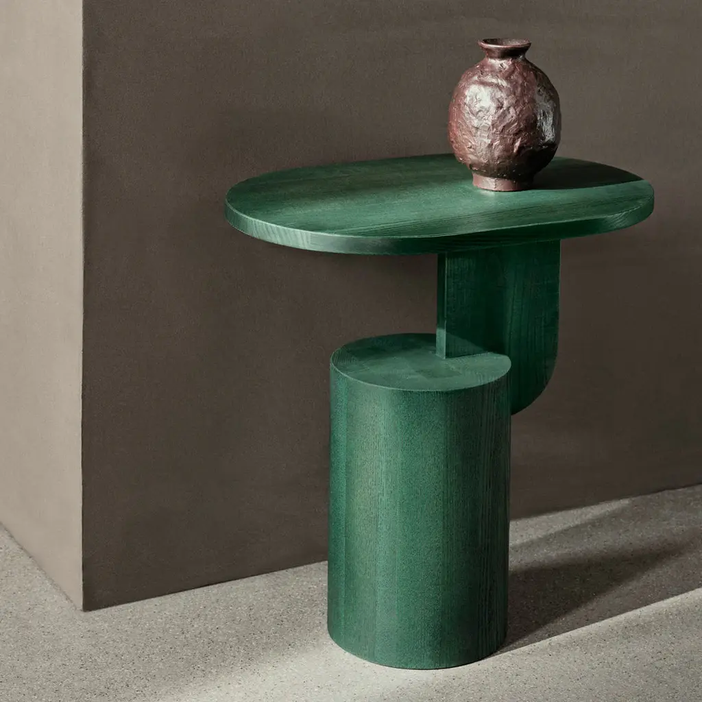 Crafted from solid ash, this design forms a sturdy, yet sculptural side table. It expresses the meeting of the heavy cylinder base and the light oval top, seemingly floating on the small, geometric joint. The table is a subtle piece of art in your home, and the small size makes it perfect for rooms of all sizes. The Insert Side Table comes in natural, black stained ash, and myrtle green.