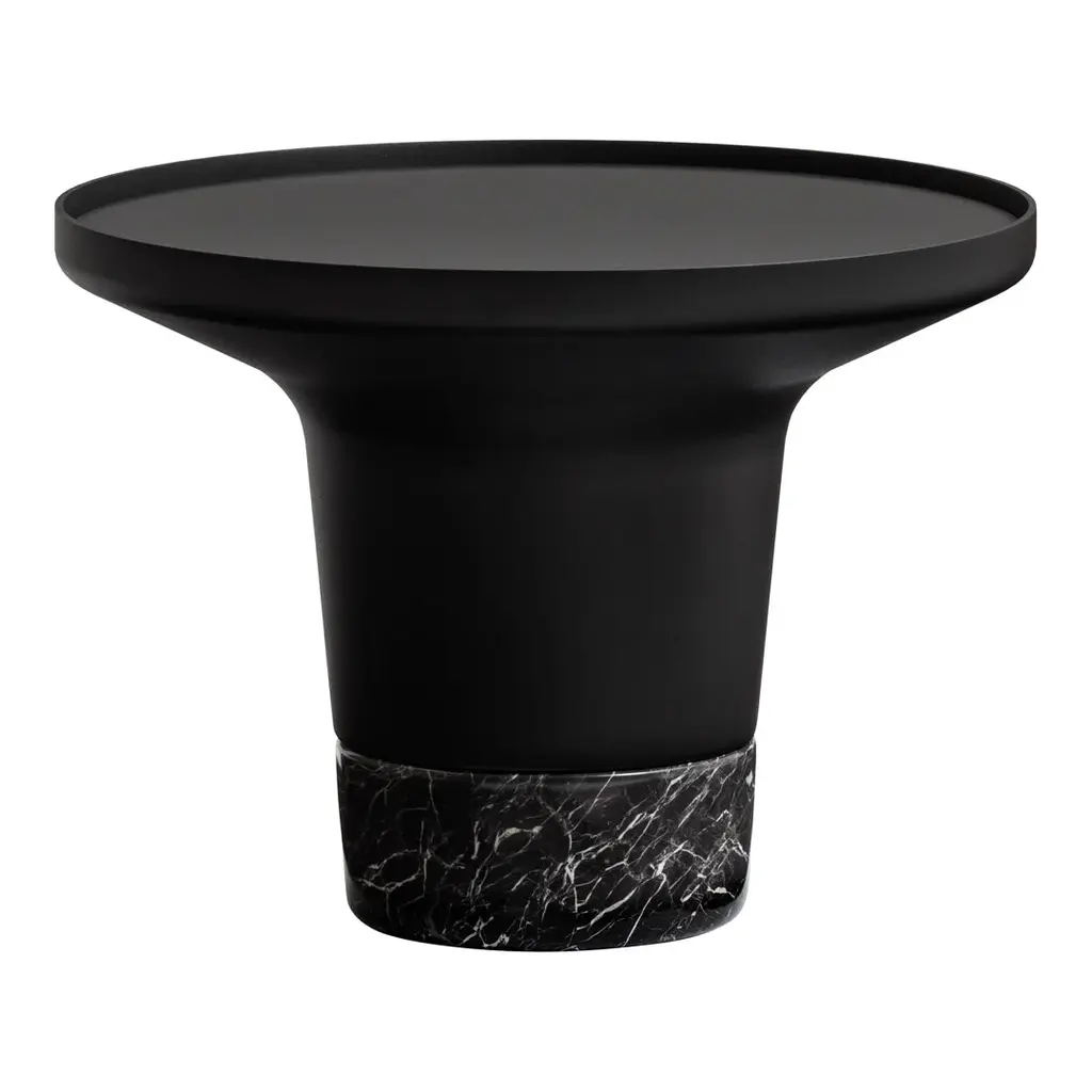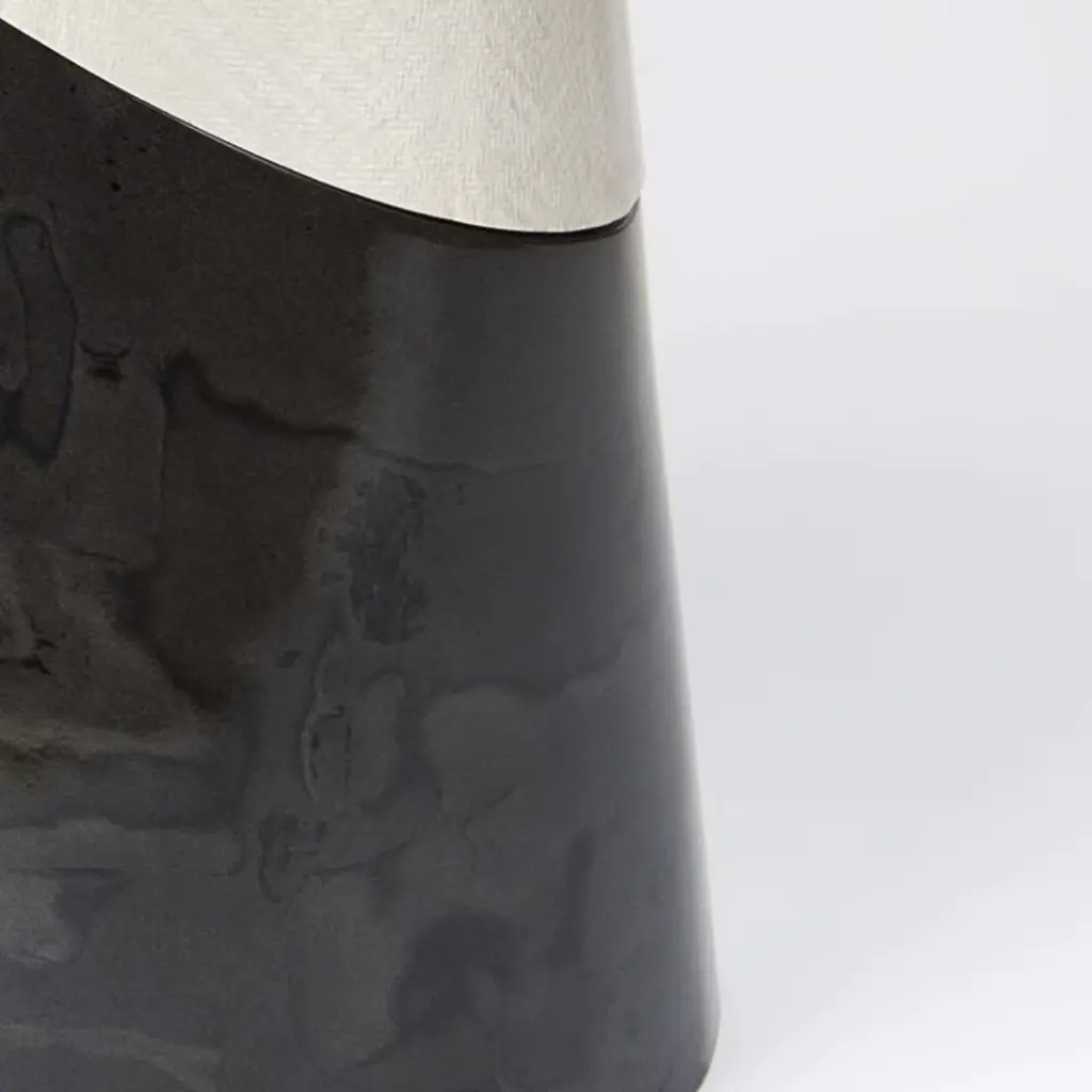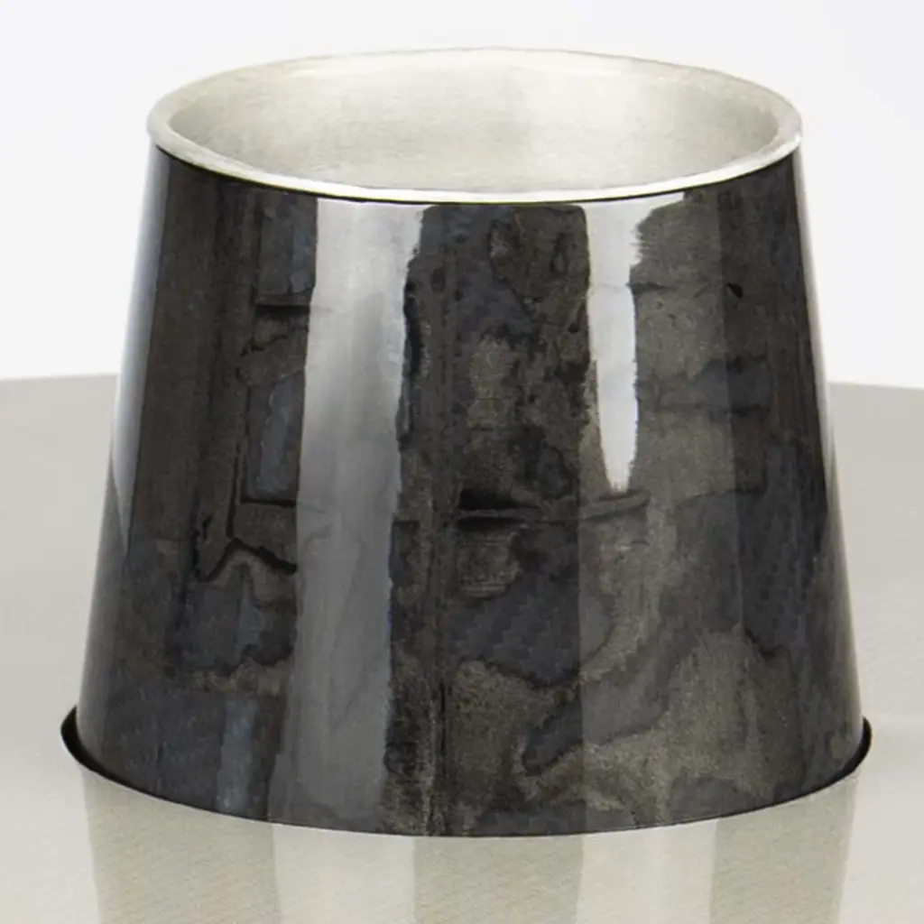 This striking and elegant side table is part of the Invariants collection. It was crafted using materials exclusively developed by Frisoli during their 30 years of experience in aeronautical engineering. The conical support structure is in Frisoli Lachesi, a mix of carbon fiber and glass fiber to which is added aerospace material by slowly pouring it, creating a one-of-a-kind decorative pattern. The round top is in Frisoli Artemide that adds silver to the carbon fibers to create an ethereal and shimmering effect.