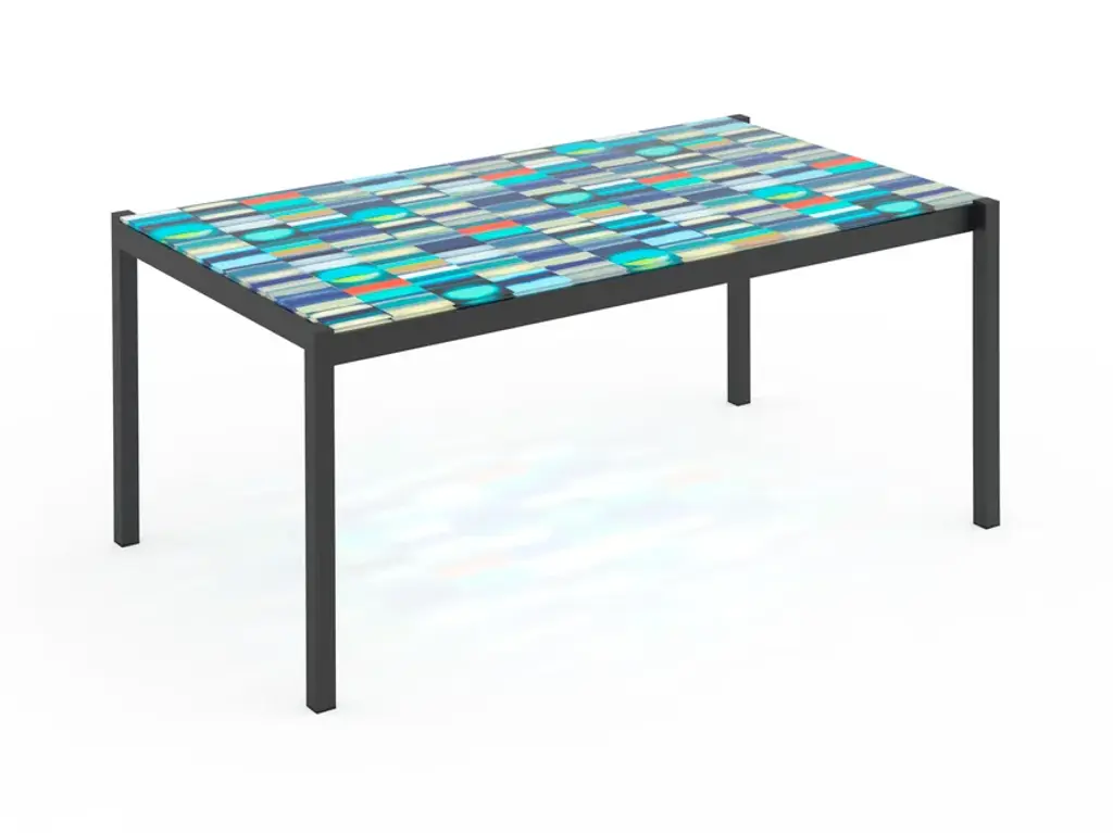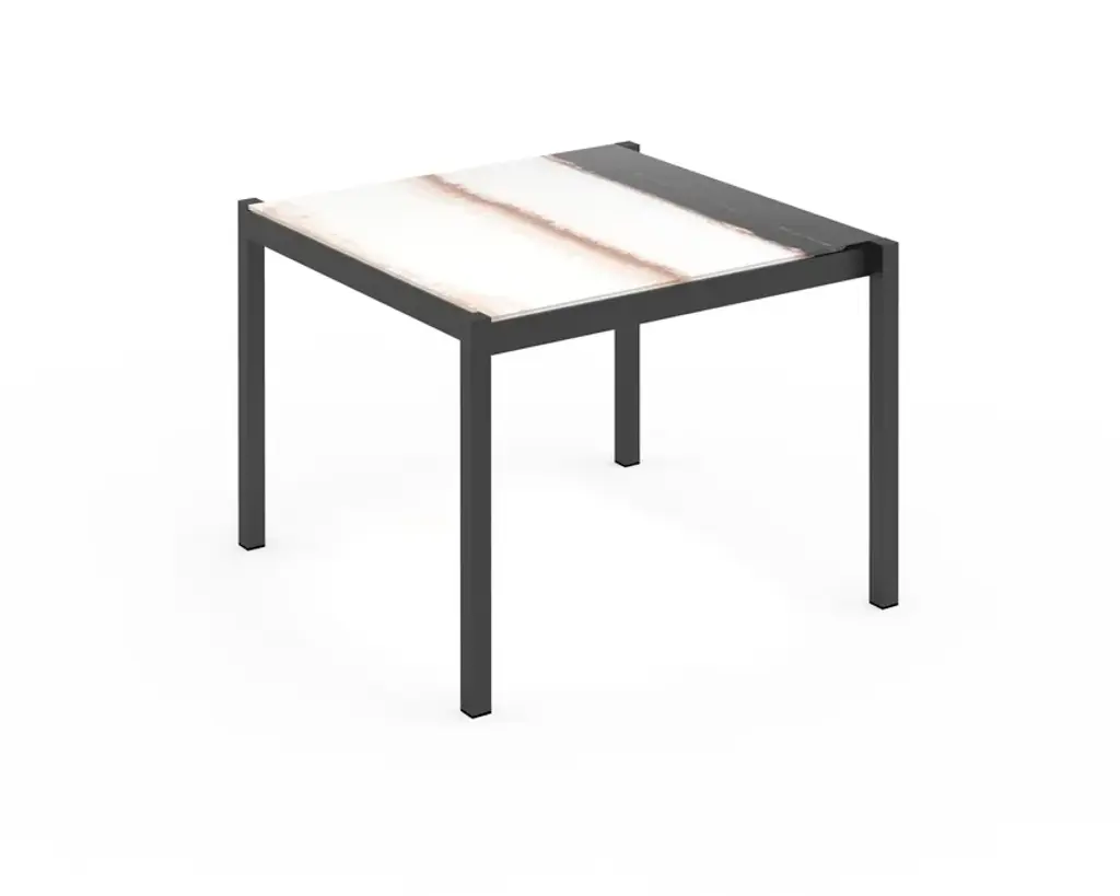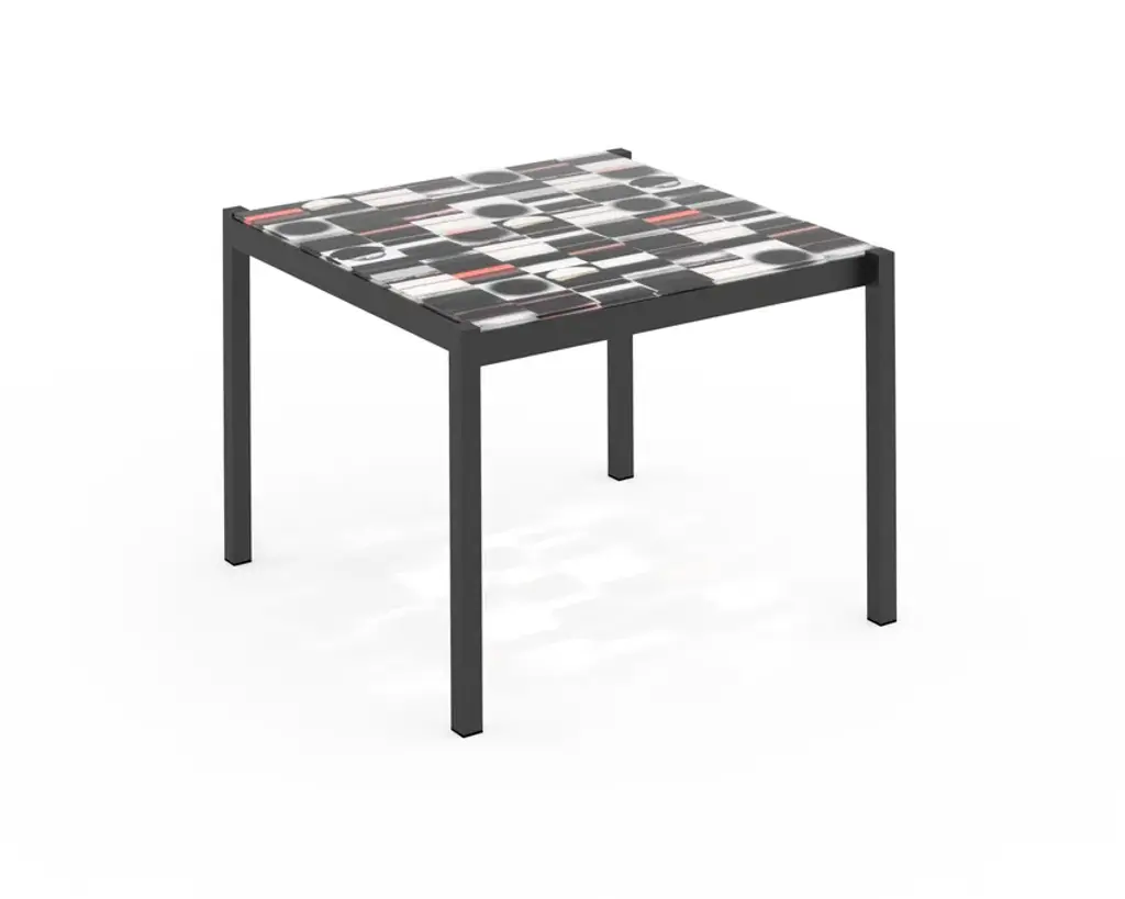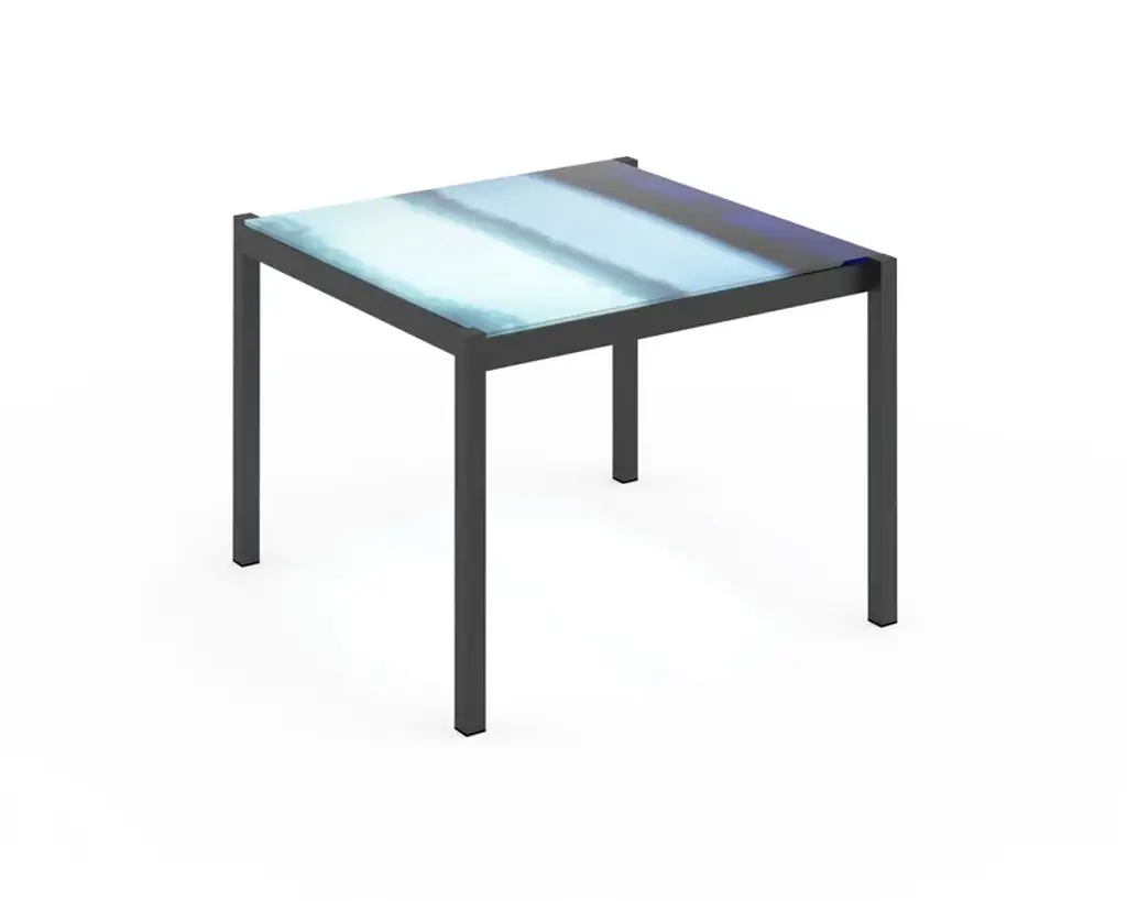 Iris is the new collection of coffee tables and side tables by Alejandra Gandía-Blasco for GANDIABLASCO. The main idea behind the IRIS series is ‘art applied to design’: the colour study of the works created by the designer herself is transferred to the printed vitrified tempered glass table tops, which are suitable for outdoor use. The IRIS tables come in different heights and finishes, and their dimensions complement all of GANDIABLASCO’s outdoor furniture collections. The IRIS designs combine GANDIABLASCO’s classic powder coated aluminium structures with innovative printed glass tabletops thanks to a unique blend of art and new technologies. These surfaces are made of printed vitrified tempered glass, a pure and environmentally-friendly material designed with the best technical, aesthetic and sustainable features that guarantee a high level of durability.Tempered printed glass allows for the creation of a wide range of surfaces, through richly-coloured digital designs that vary between transparency and translucency. The designs are fused into the glass with ceramic pigments which, after tempering the glass, are completely vitrified. The glass is fitted directly into the structure, without the need for external fittings, allowing for preservation of the design of the glass. In this case, the digital designs are grounded in the plastic art which is based on the series of sunrises and sunsets captured by the artist Alejandra Gandía-Blasco. Tailor-made designs and materials are combined to create a dynamic and distinctive collection.
