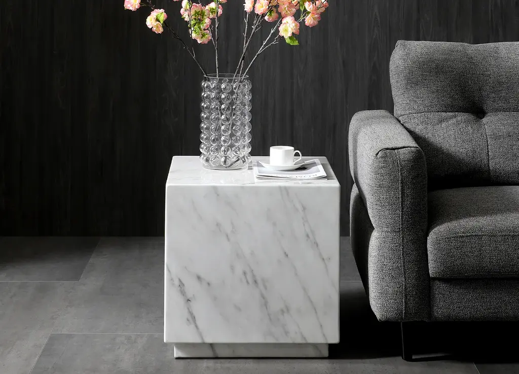 Marble, a material of timeless appeal, inspired the concept of the Iris side table, displaying an unconventional elegance and versatility in placement.