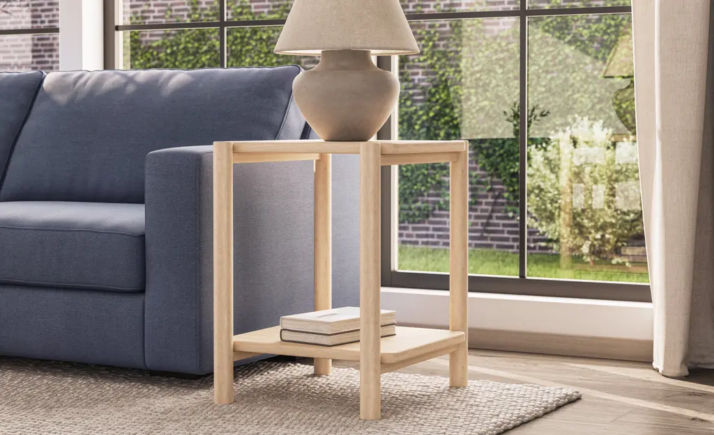 Iris Side Table's open design lets your favorite possessions shine, with a lower shelf for plenty of styling potential. Its narrow profile fits neatly into any nook or next to your seat for easy access to your drink: cheers!Tops and sides crafted in your choice of beautiful, 100% solid hard White Maple or American Walnut. For additional strength and lightness, FSC-certified, low-VOC CARB 2 compliant Maple or Walnut hardwood plywood is used elsewhere.