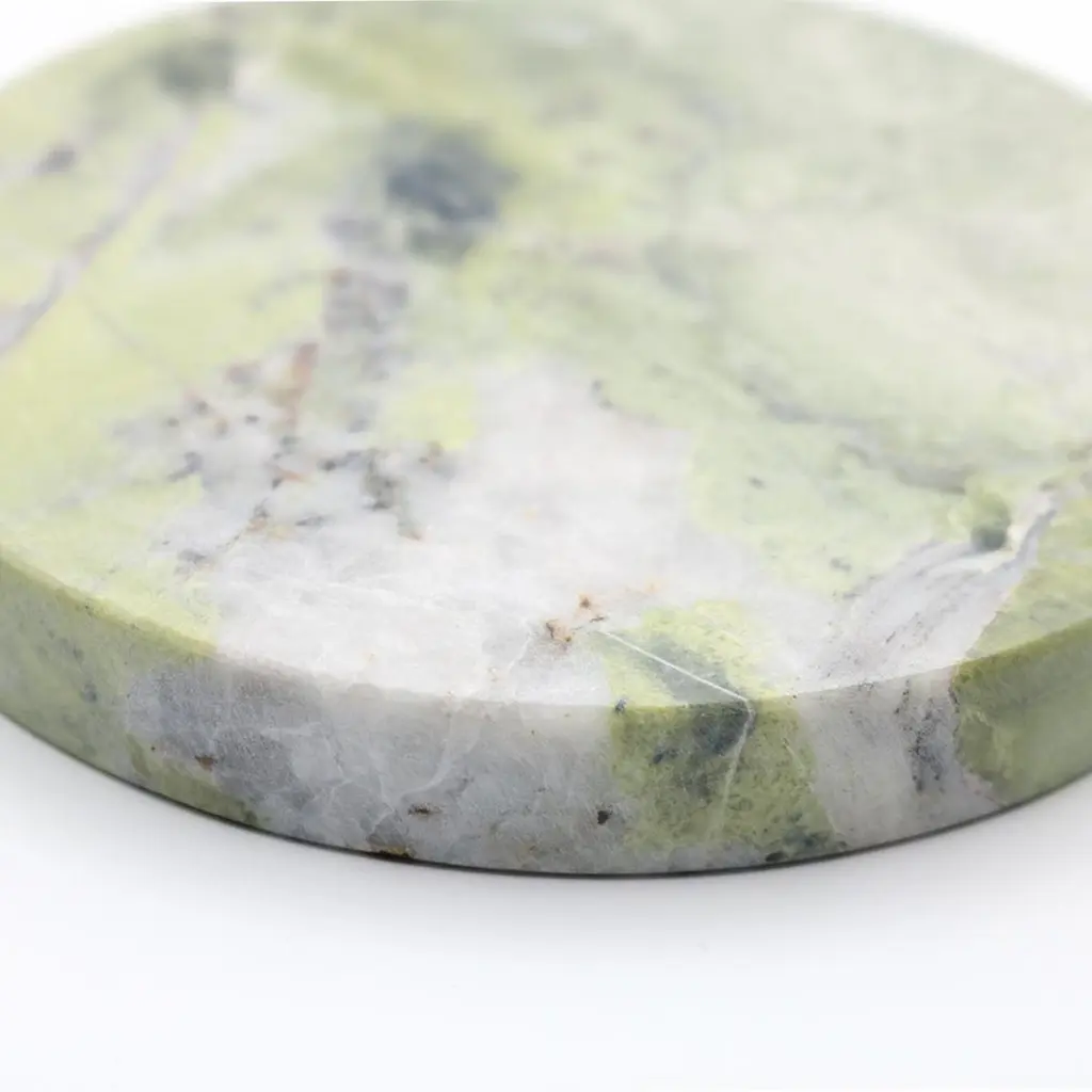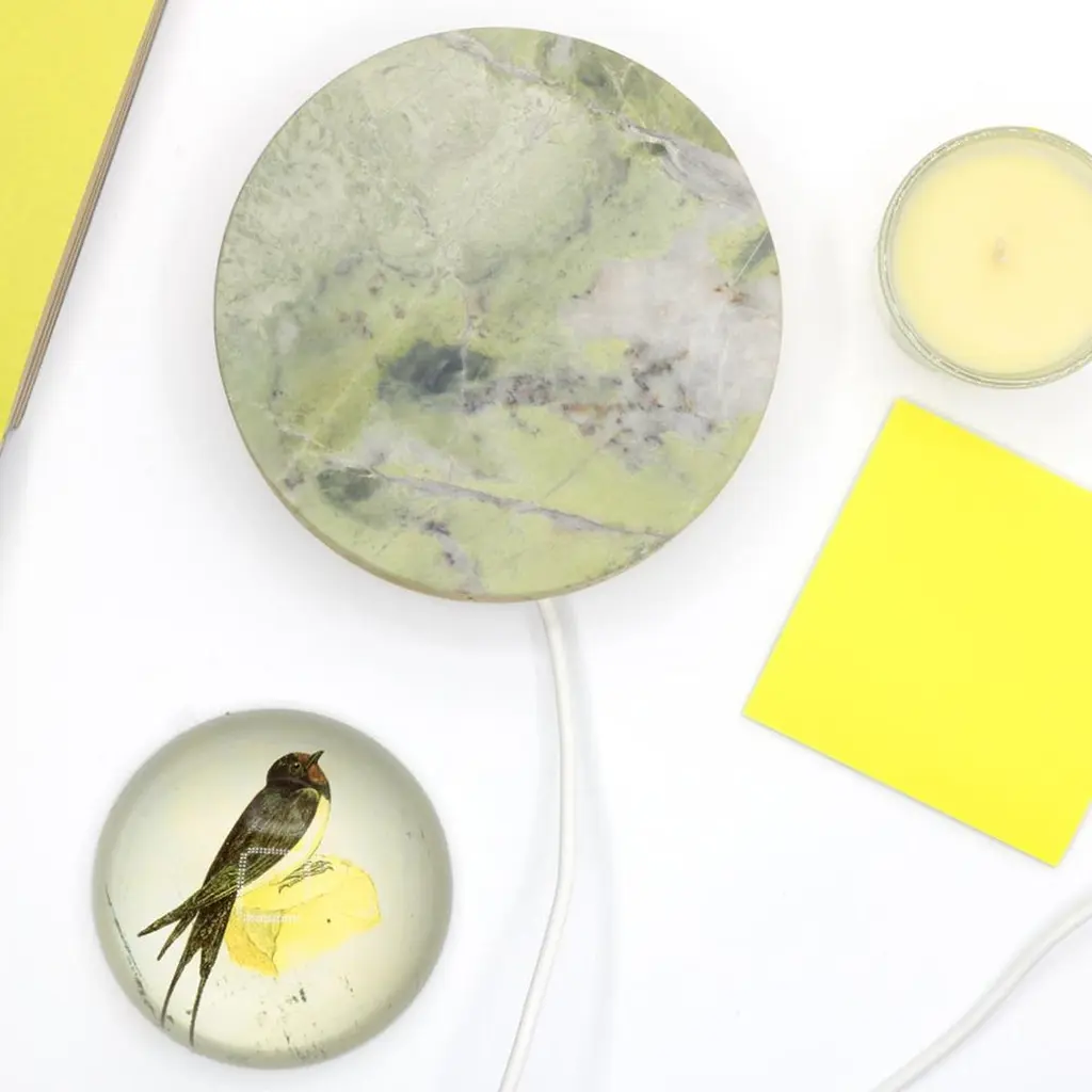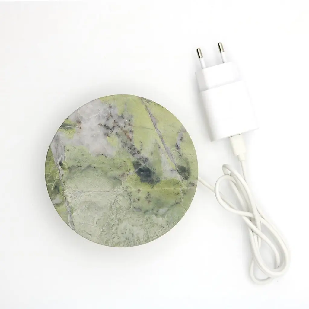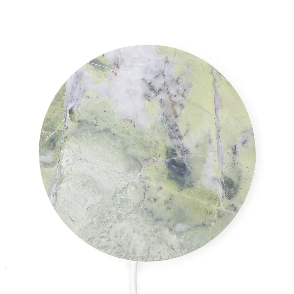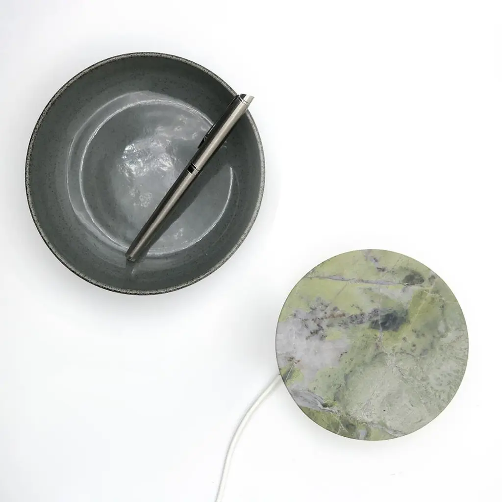 A marble base,that quickly charges your phone, with a touch of magic. A circle, a stone, realized with the care that marble requires.A powerful wireless charging technology ensures an efficient and reliable power delivery.The result is a magical object, with a natural feeling,a piece of art that wonderfully fits on any table or bedside table,or everywhere you imagine.Rare and beautiful, it is found exclusively along the rugged and wild Atlantic coast of Ireland. This marble is unique like the spectacular landscape it forms, with greens of almost all shades mixed with cold and white spots.Designed and manufactured in Italy, 100% Italian marble, 0% plastics.- 15W power supply included in the box.- Measures: Integrated cable: 90cm (3ft)- Base diameter Ø 12cm (4.72in) Compatible with all Qi-enabled devices.