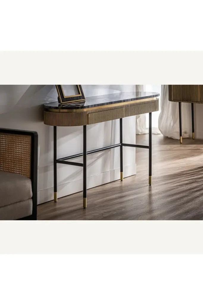 The Valbruna Console by Vical Home is a jewel of design. Made of iron with marble details, this console combines the solidity of metal with the sophistication of gold. Its shiny finish and subtle design make it perfect for those looking for a piece of furniture with a glamorous touch. With the Valbruna hall table, your entrance or living room will look like never before.