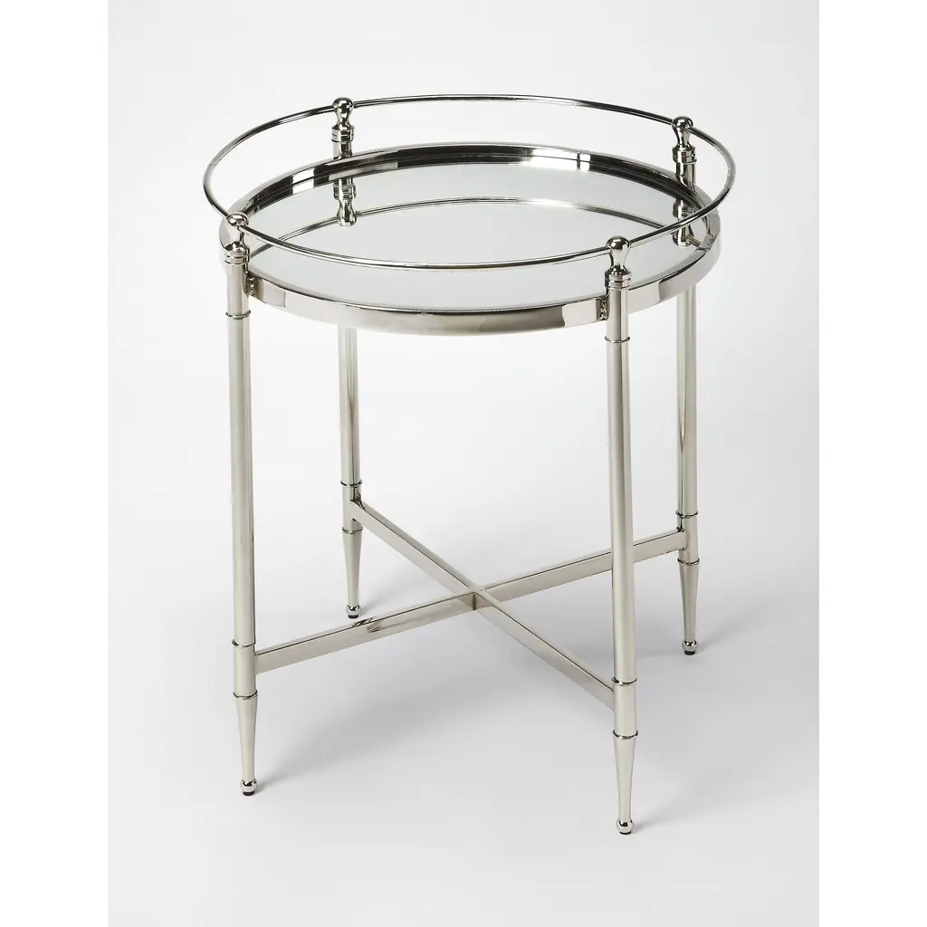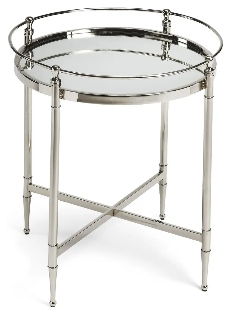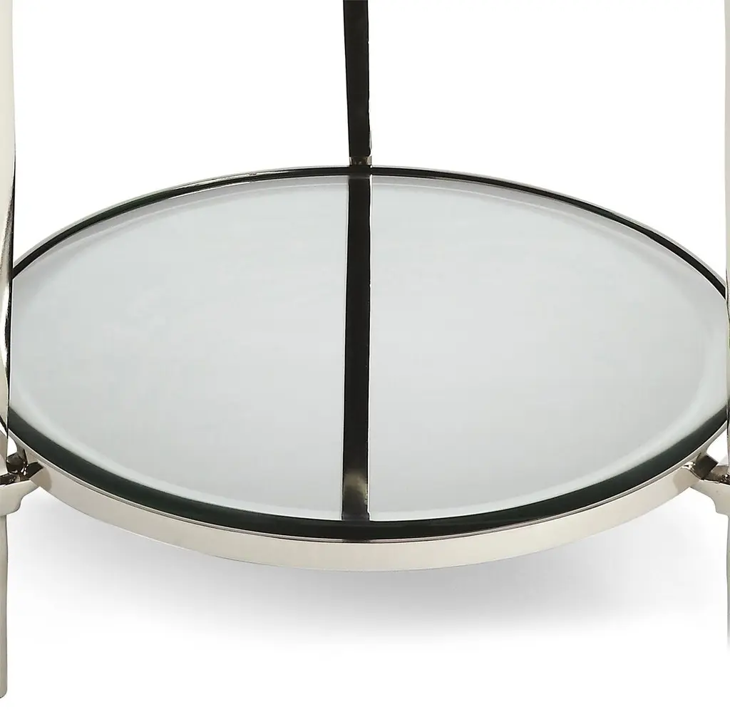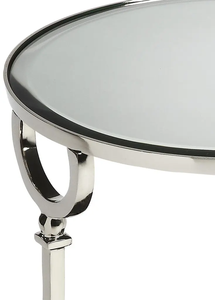 A sophisticated and elegant addition to the living room, den, or bedroom, this side table is framed in aluminum with a polished silver finish and two round surfaces inlaid with mirrored glass.