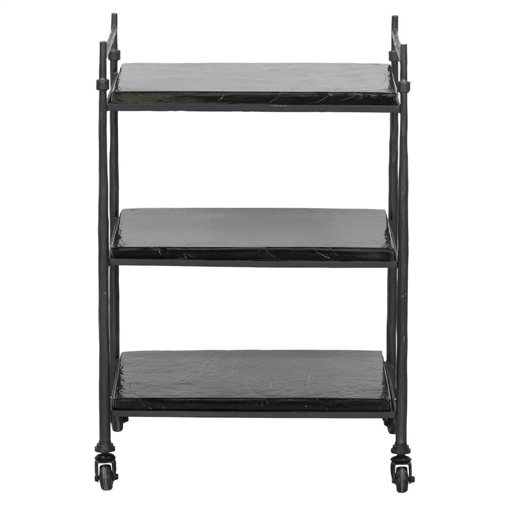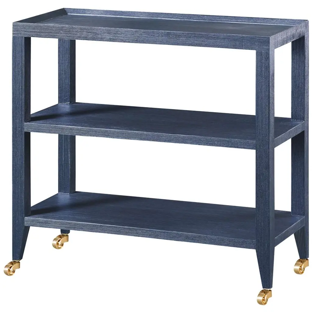 The Isadora Collection revisits old world luxury through a modernist lens, bringing structural furnishings to life with rich finishes, polished hardware, and a portable aspect that harks back to the golden age of entertaining, when pieces were rolled into parlors and drawing rooms according to one's needs. Of course, Villa & House has timelessness in mind when it comes to the likes of our Isadora Side Table, a longstanding staple of our collection. Featuring an open silhouette wrapped in lacquered navy blue grasscloth, stacked shelves, and a tabletop with a slightly inclined edge, the piece is ideal for everyday use or decorative display. Set on four brass wheels, the Isadora is glamorous yet practical, and can act as a versatile serving table or bar cart.