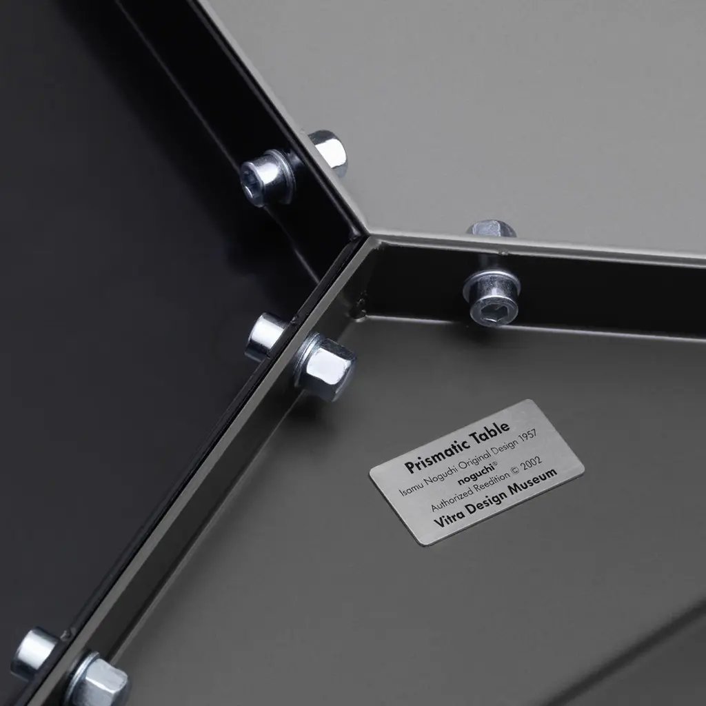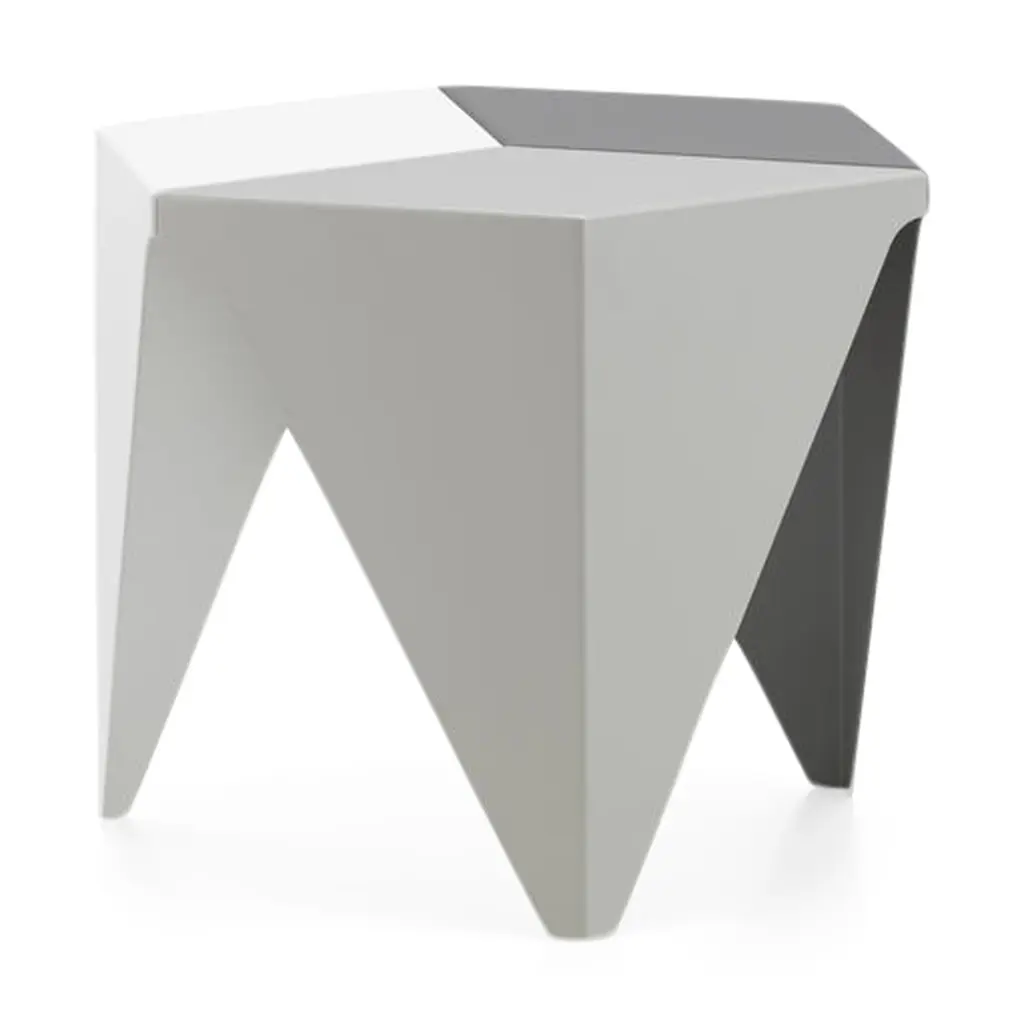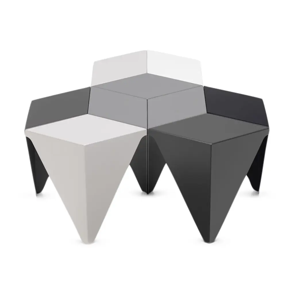 In the mid-1950s, designer and landscape architect Isamu Noguchi began experimenting with aluminum, a material that had become fashionable in interior design. In 1957, he conceived the Prismatic Side table, a design composed of three folded pieces of aluminum fastened together to create a hexagonal top that transitions into three legs. After developing several monochromatic variations, he designed these three versions in arrangements of three different shades of gray. Singularly, the Prismatic Side Table is a striking addition to your living room. Grouped together, several tables reveal kaleidoscope-like patterns. The Isamu Noguchi Prismatic Side Table is made of powder-coated aluminum and measures 14.75h x 16.25w x 16.25"d. Each table is sold separately. Both Isamu Noguchi and Vitra, the table’s manufacturer, have work in MoMA’s collection.